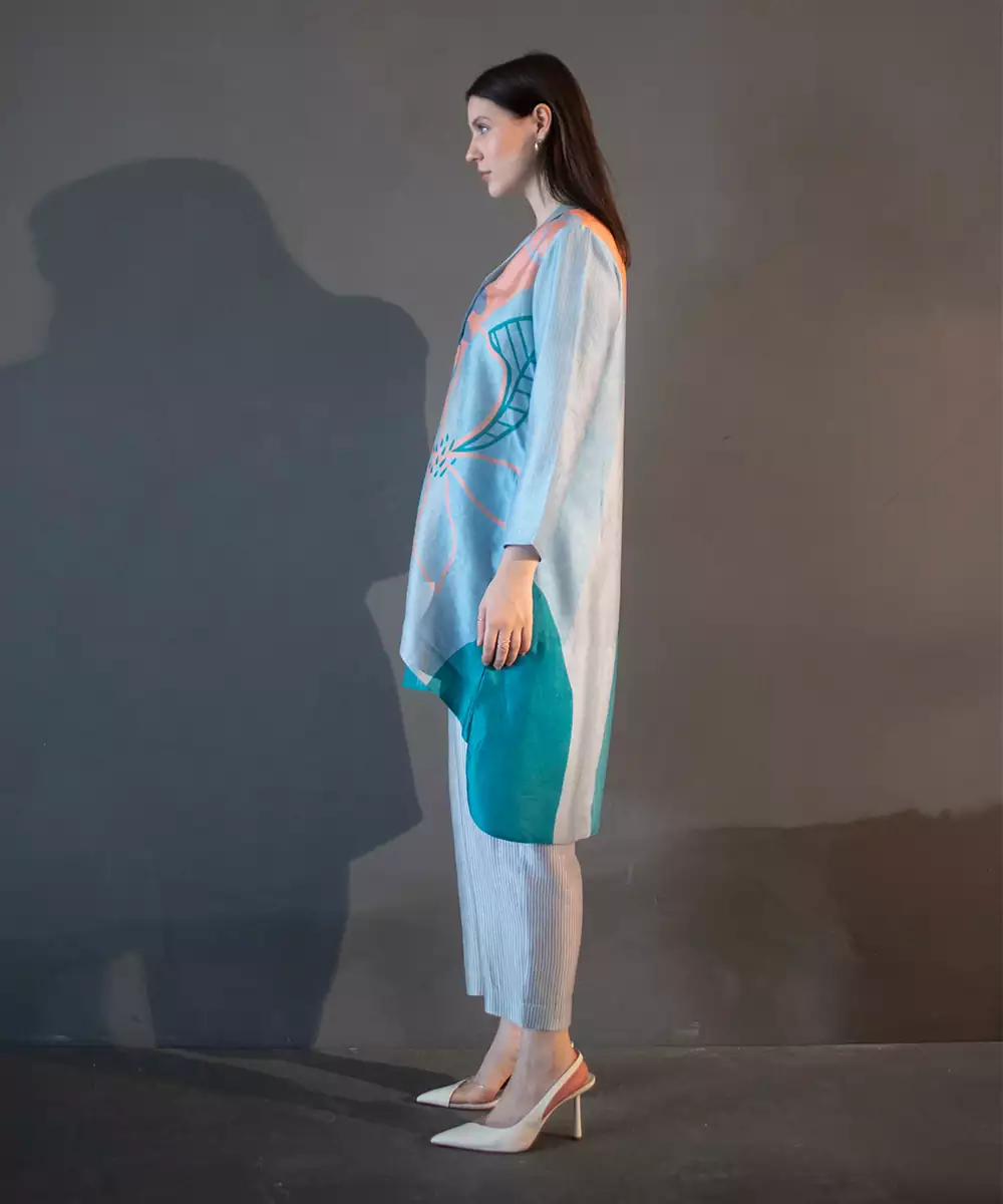 A Two Piece Dupion Silk Set Comprised Of Abstract Geometric And Floral Print In Playful Color Compositions And Parallel Pants With Fusion Textiles.