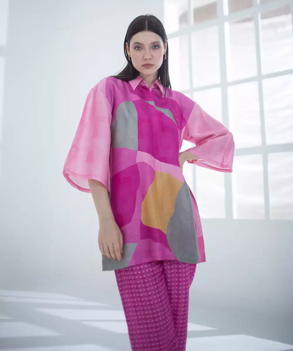 A Two Piece Dupion Silk Set Comprised Of Abstract Geometric And Floral Print In Playful Color Compositions And Parallel Pants With Fusion Textiles.