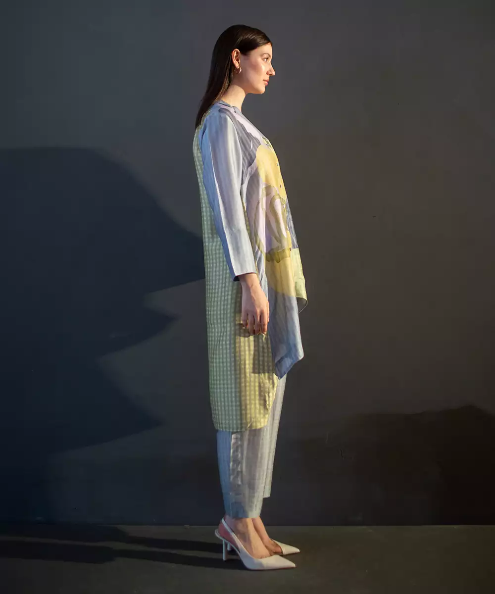 A Two Piece Dupion Silk Set Comprised Of Abstract Geometric And Floral Print In Playful Color Compositions And Parallel Pants With Fusion Textiles.