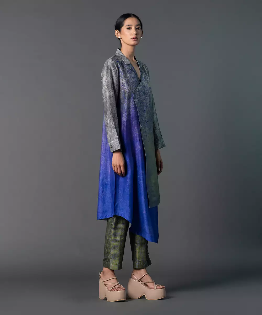 Featuring A Grey And Blue Ombre Printed Assymetric Shirt Tunic With Solid Blue Pleats. Paired With Coordinating Printed Straight Pant. Color : Grey And Blue