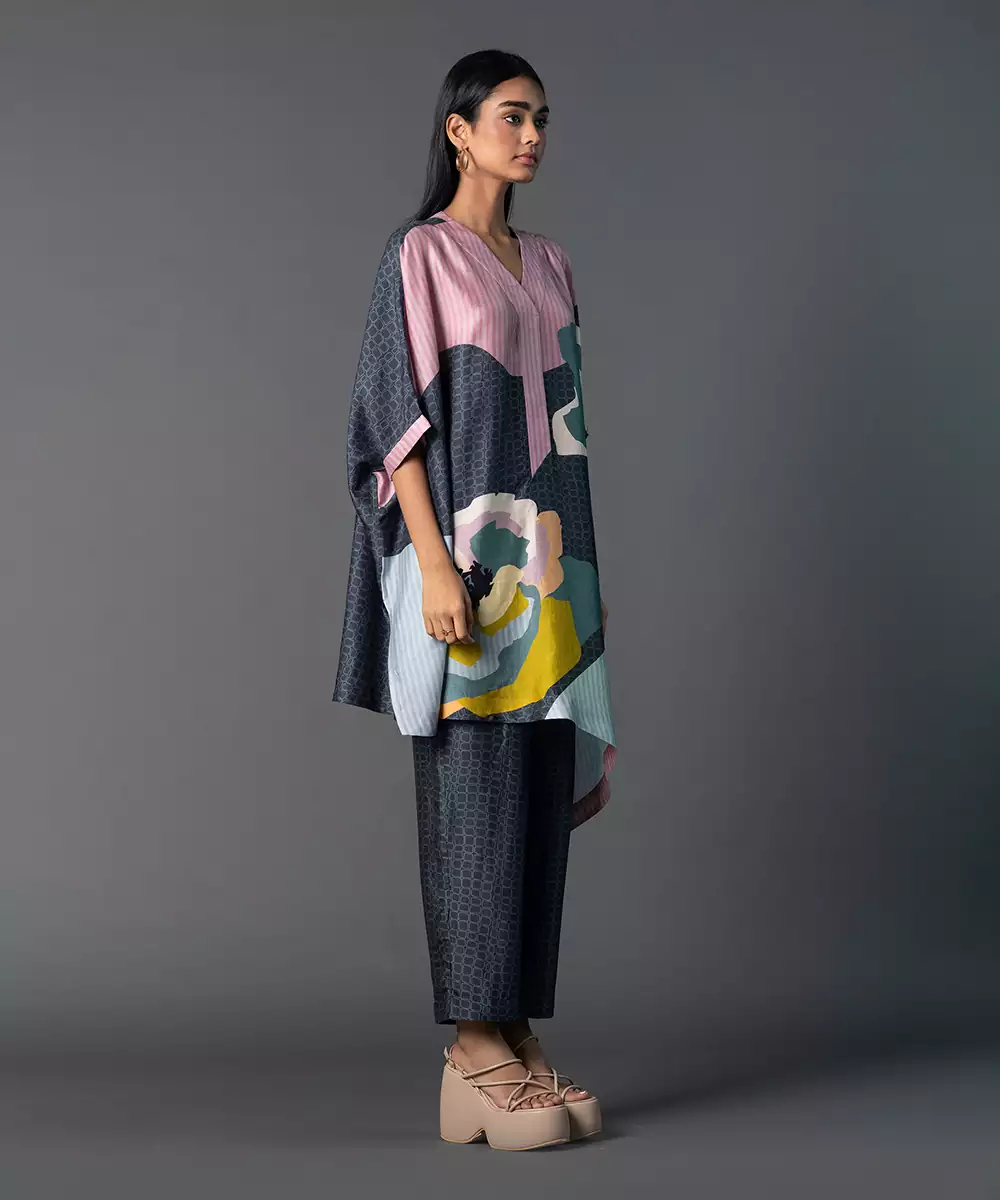 Featuring A Dark Grey & Light Pink Kurta With Abstract Print And Asymmetric Hem On One Side. Paired With A Plain Straight Pant. Color : Multi Color