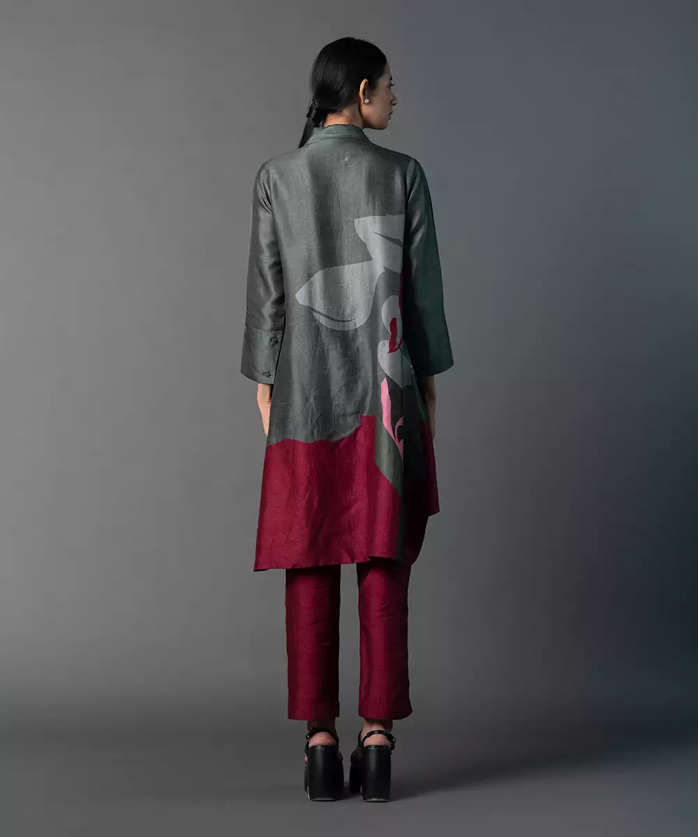 Featuring A Dark Grey & Maroon Abstract Printed Shirt Kurta With Asymmetric Hem And Placed Hand Embroidered Sequins. Paired With A Plain Straight Pant. Color : Multi Color