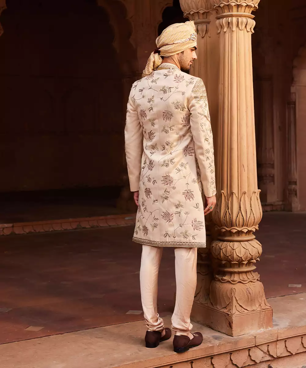 A Heavily Intricate Hand Embellished Sherwani With Geometrical And Floral Pattern, Comes With Kurta, Pants And Embroidered Stole . Colour: Beige Fabric: Jacquard Components : 1 Jacket / 1 Stole / 1 Kurta / 1 Churidar