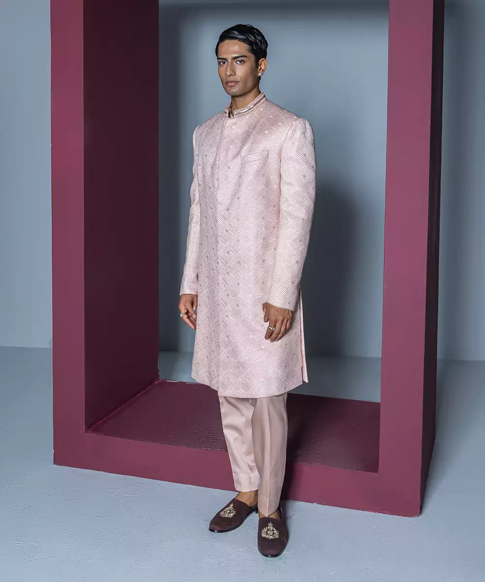 A Blush Pink Shrug Set With Multi Coloured Handpaint Details, Paired With Kurta And Pants. .