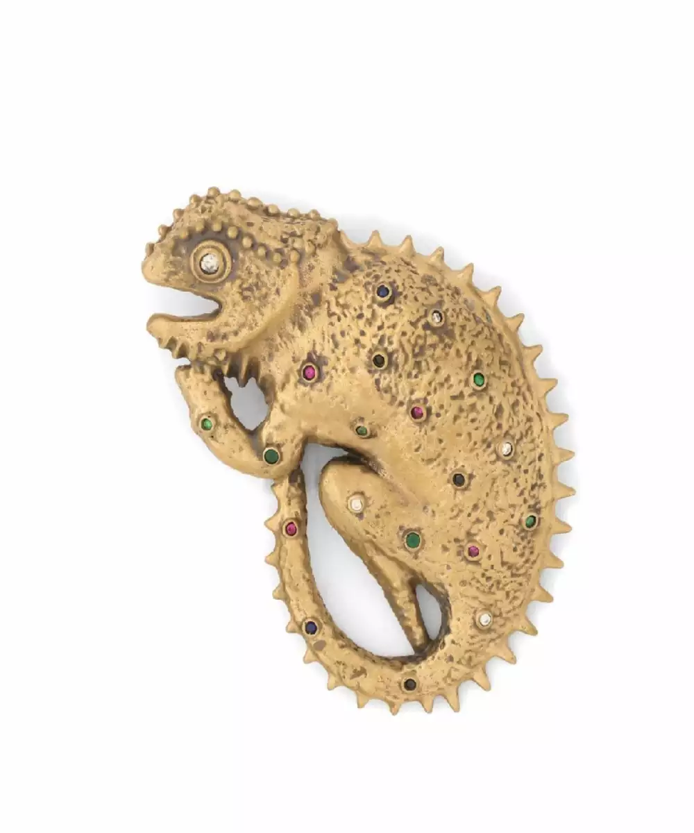 Crafted With Versatility, The Brass Made Chameleon Brooch Is A Masterpiece Of Nature Inspired Jewelry. The Red And Green Diamonds Fixated On The Body Of The Chameleon Give It A Bewitching Look. This Brooch Is Made To Match And Beat All The Ongoing Fashion Trends.