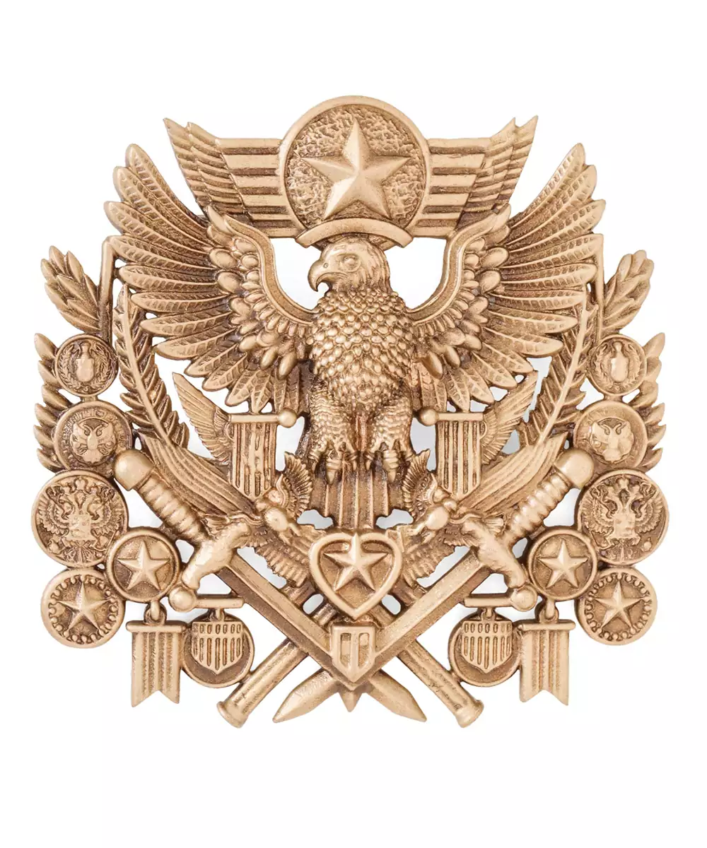 Command Attention With The Imperial Eagle Crest Brooch, A Symbol Of Power And Prestige. This Exquisitely Detailed Brooch Showcases A Regal Eagle With Outstretched Wings, Surrounded By An Array Of Military Inspired Insignias And Symbols. The Antique Gold Tone Finish Accentuates The Intricate Craftsmanship, Making It A Striking Accessory For Those Who Appreciate Bold And Distinguished Designs. Lightweight And Versatile, This Brooch Is The Perfect Addition To Coats, Jackets, And Bandhagalas, Adding A Touch Of Authoritative Elegance To Both Formal And Ceremonial Attire.