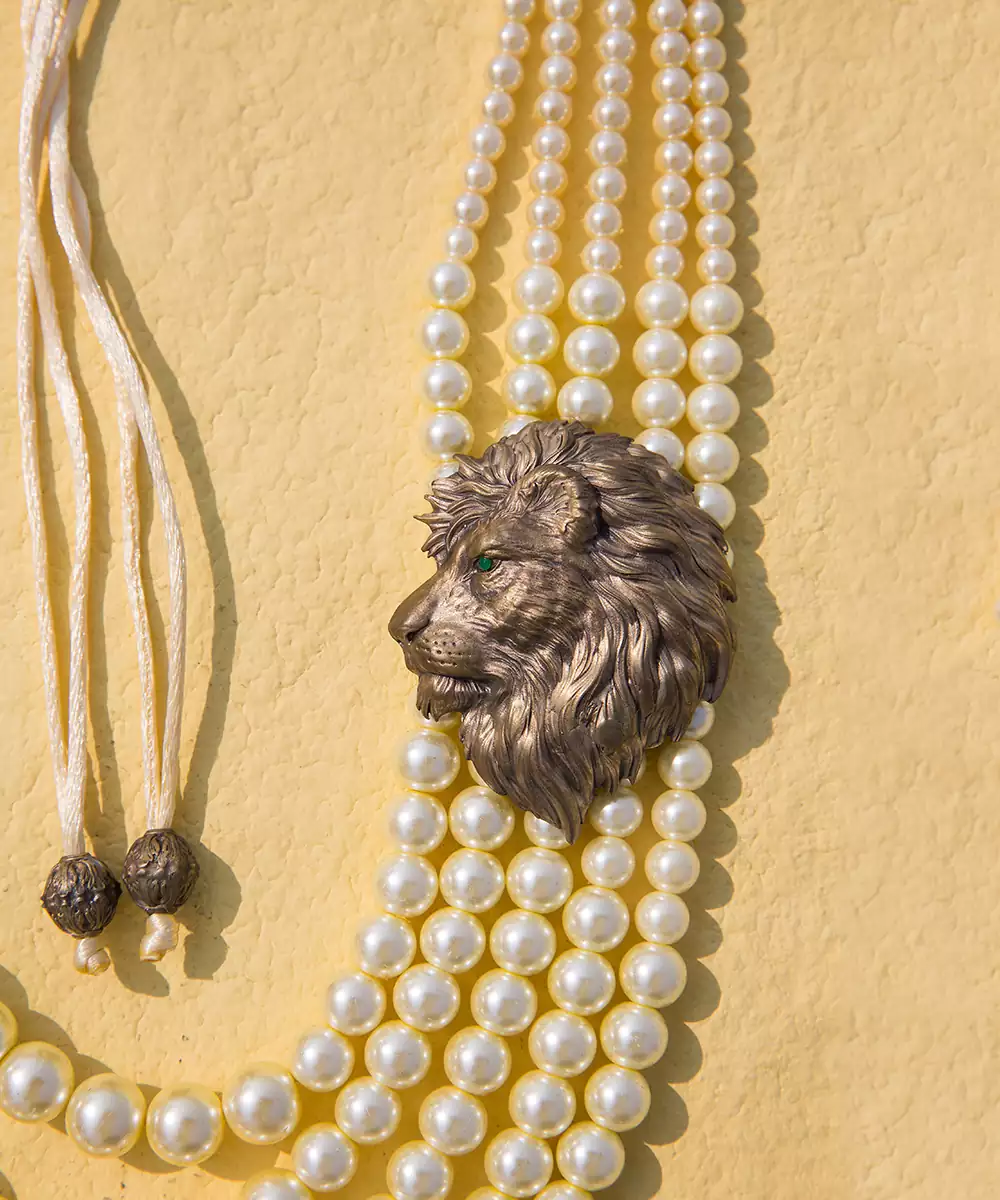 Featuring A 5 Layered Off White Groom Mala Studded With Pearl Beads With Antique Lion Motif, Set In Brass. Wear This Precious Adornment On A Sherwani Or Bandhgala. This Mala Is A Wedding Essential.