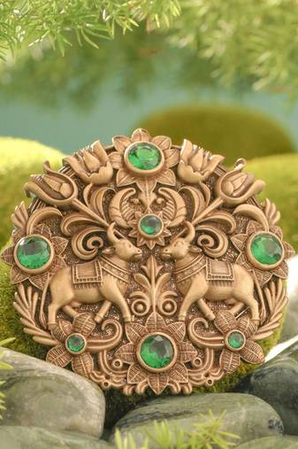 Illuminate Your Ensemble With The Emerald Radiance Brooch, A Captivating Piece That Showcases The Elegance Of Ancient Artistry. Adorned With Lush Green Gemstones Set Within A Radiant Floral Design, And Flanked By Intricately Detailed Sacred Bulls, This Brooch Is A Testament To Timeless Luxury And Cultural Richness. The Lightweight Construction Ensures Comfort, Making It A Perfect Accessory For Coats, Jackets, And Bandhagalas. Whether For A Grand Celebration Or A Special Occasion, The Emerald Radiance Brooch Adds A Touch Of Opulence And Tradition To Your Look.