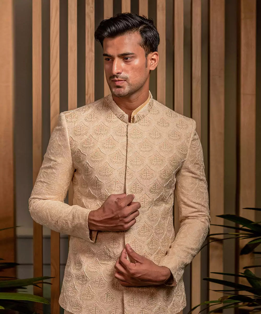 Beige Short Bandhgala In Pure Silk With All Over Self Embroidery And Thread Detailing In Front. Comes With Formal Trousers.