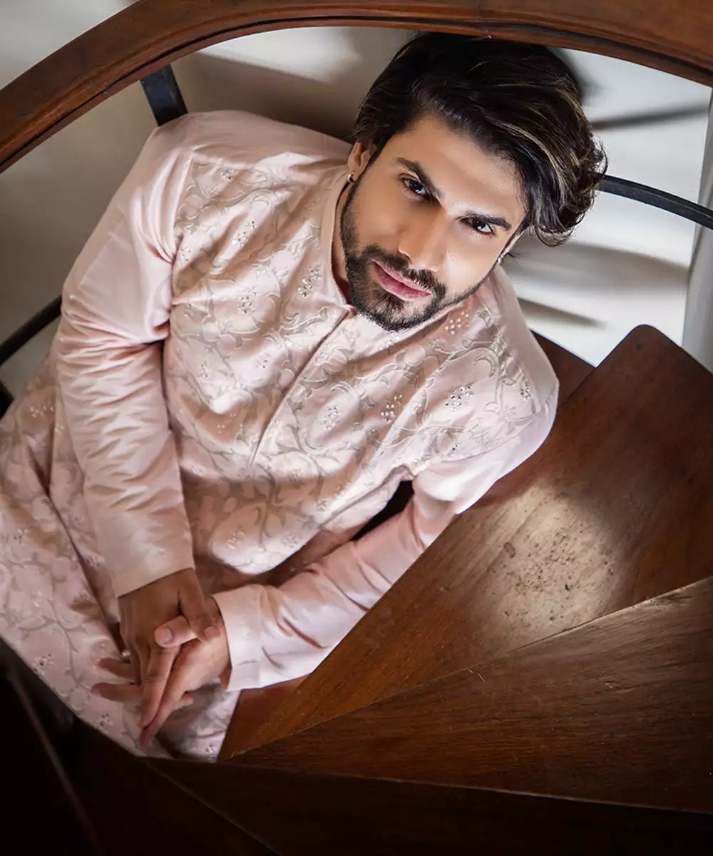 Powder Pink Kurta With All Over Applique Embroidery Using Silver Tissue Surrounding Delicate Mirror Work Motifs. This Kurta Comes As A Set With Same Colored Churidar.