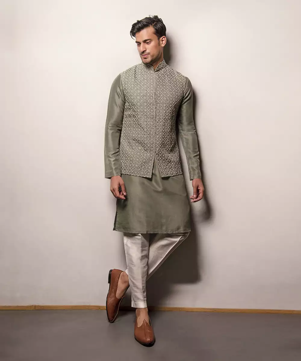 Green Hand Embroidered Organza Jacket With Threadwork And Pearl Highlights Paired With Tonal Kurta And Offwhite Pants. Embroidery In Both Front And Back.