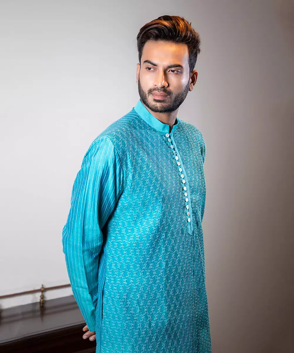Turquoise Blue Diagonal Pintuck Kurta With Mother Of Pearl Detailing Placket Paired With Churidaar.