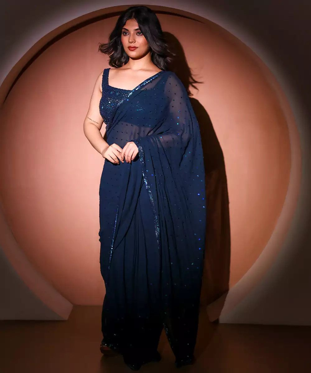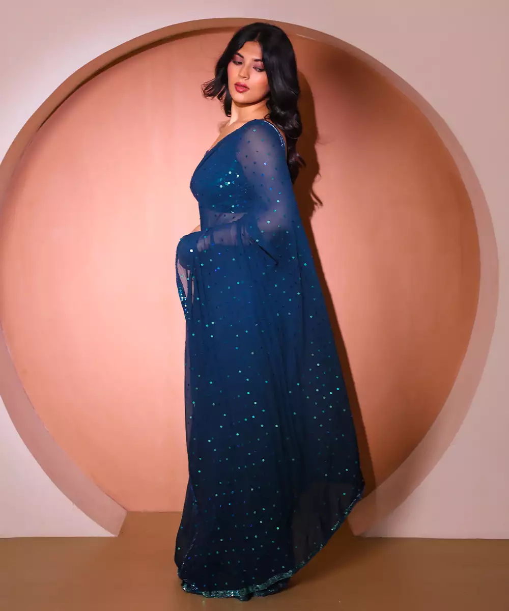 This Blue Embroidered Georgette Saree Blends Elegance With Intricate Detailing. The Lightweight Georgette Fabric Drapes Beautifully, While Delicate Embroidery Adds A Touch Of Sophistication. Perfect For Festive Occasions, Weddings, And Evening Events, It Offers A Graceful And Stylish Look When Paired With Complementing Accessories And A Chic Blouse.