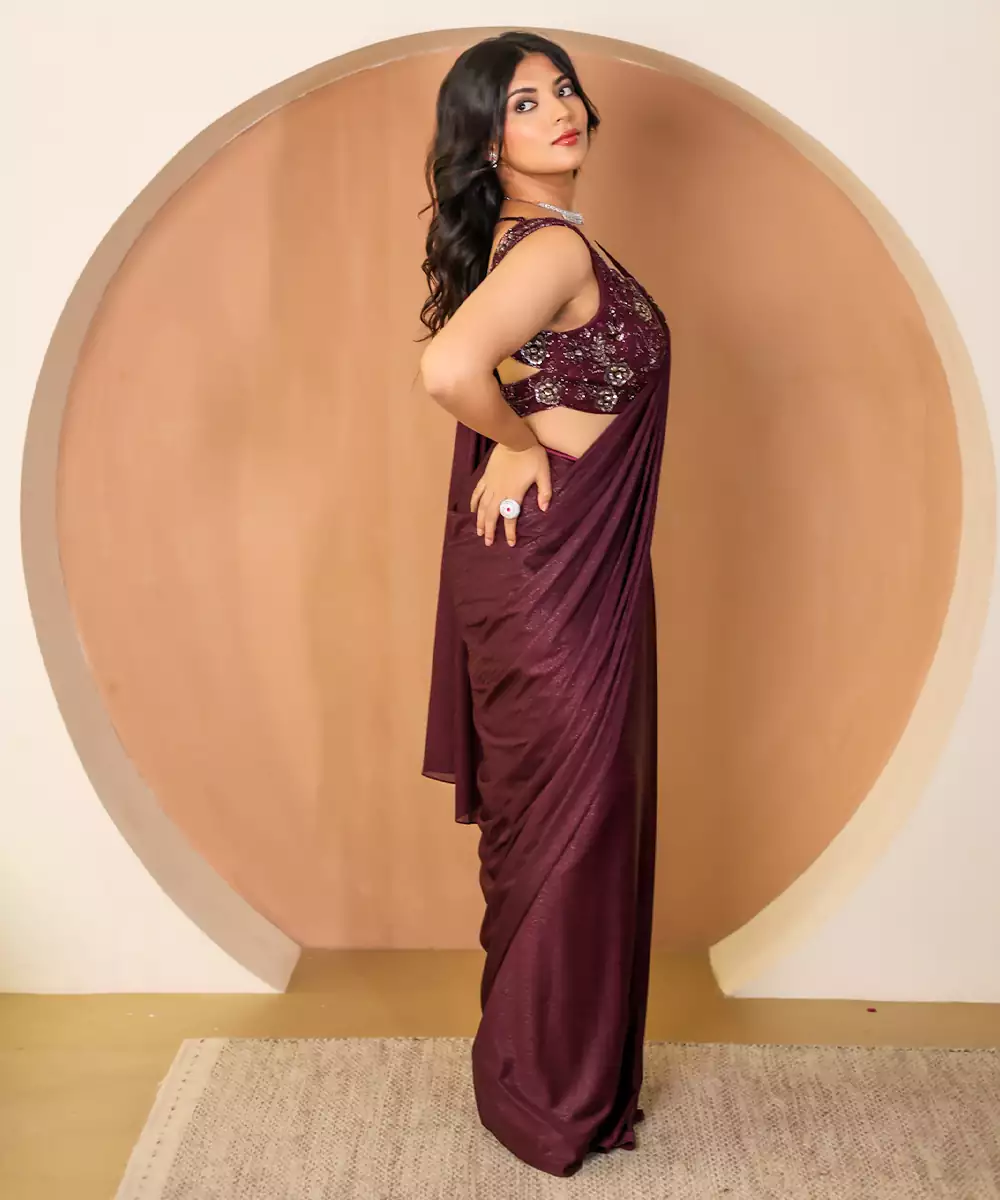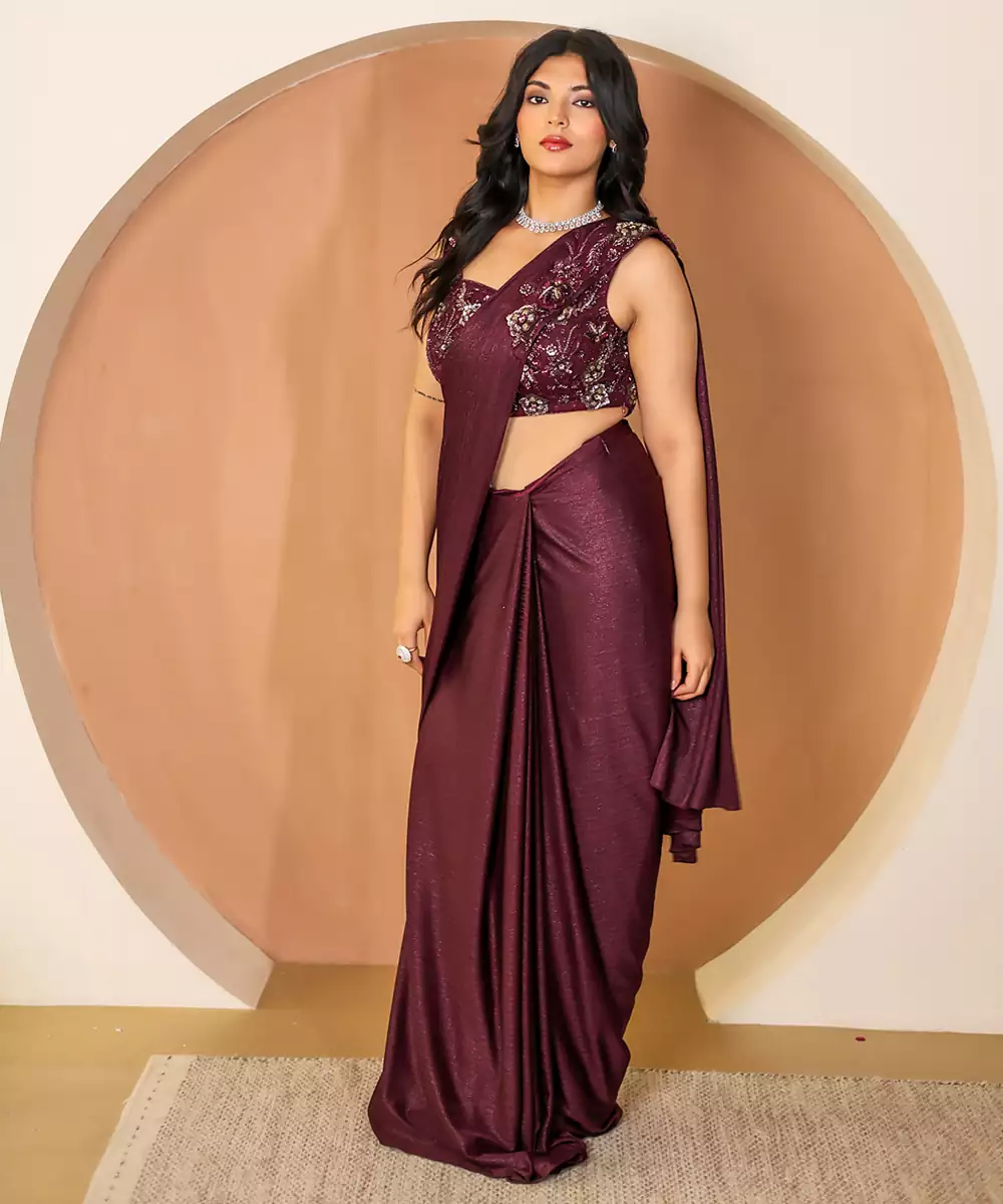 This Burgendy Plain Lycra Saree Combines Comfort With Contemporary Elegance. Crafted From Stretchable Lycra, It Drapes Smoothly And Enhances The Silhouette With Ease. Its Minimalist Design Makes It Ideal For Parties, Events, Or Casual Celebrations. Pair It With A Stylish Blouse To Complete A Chic And Modern Ethnic Look.