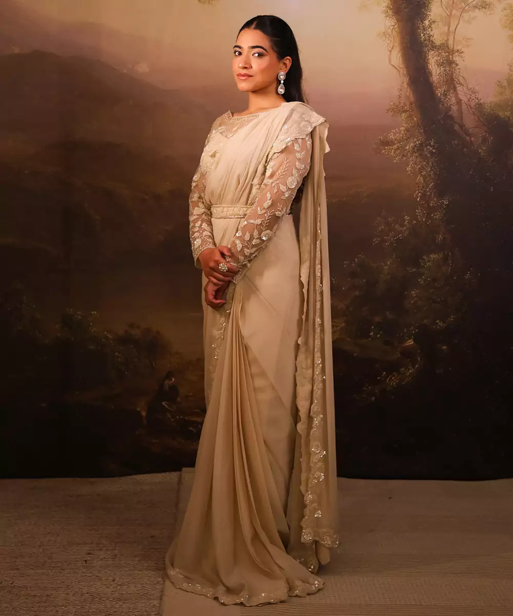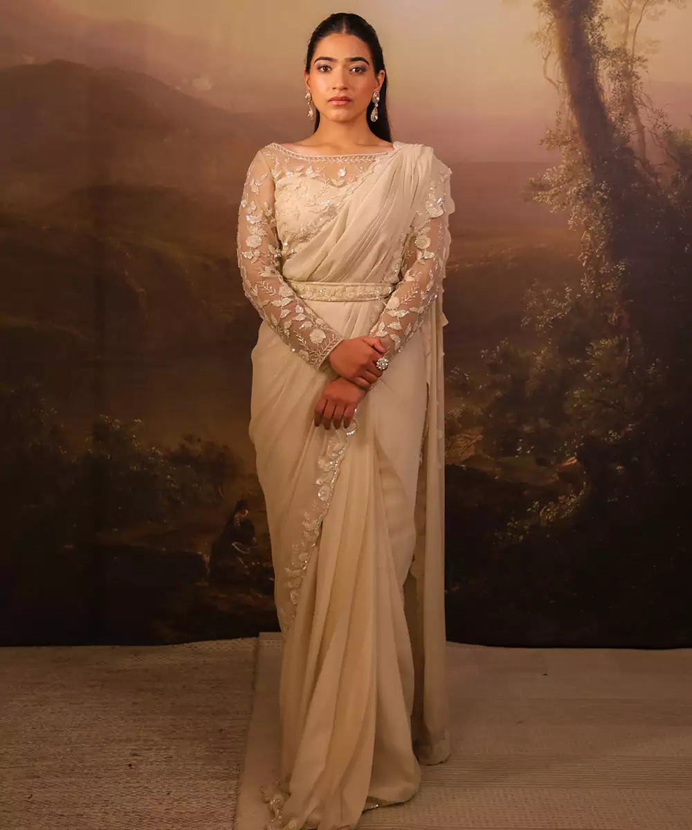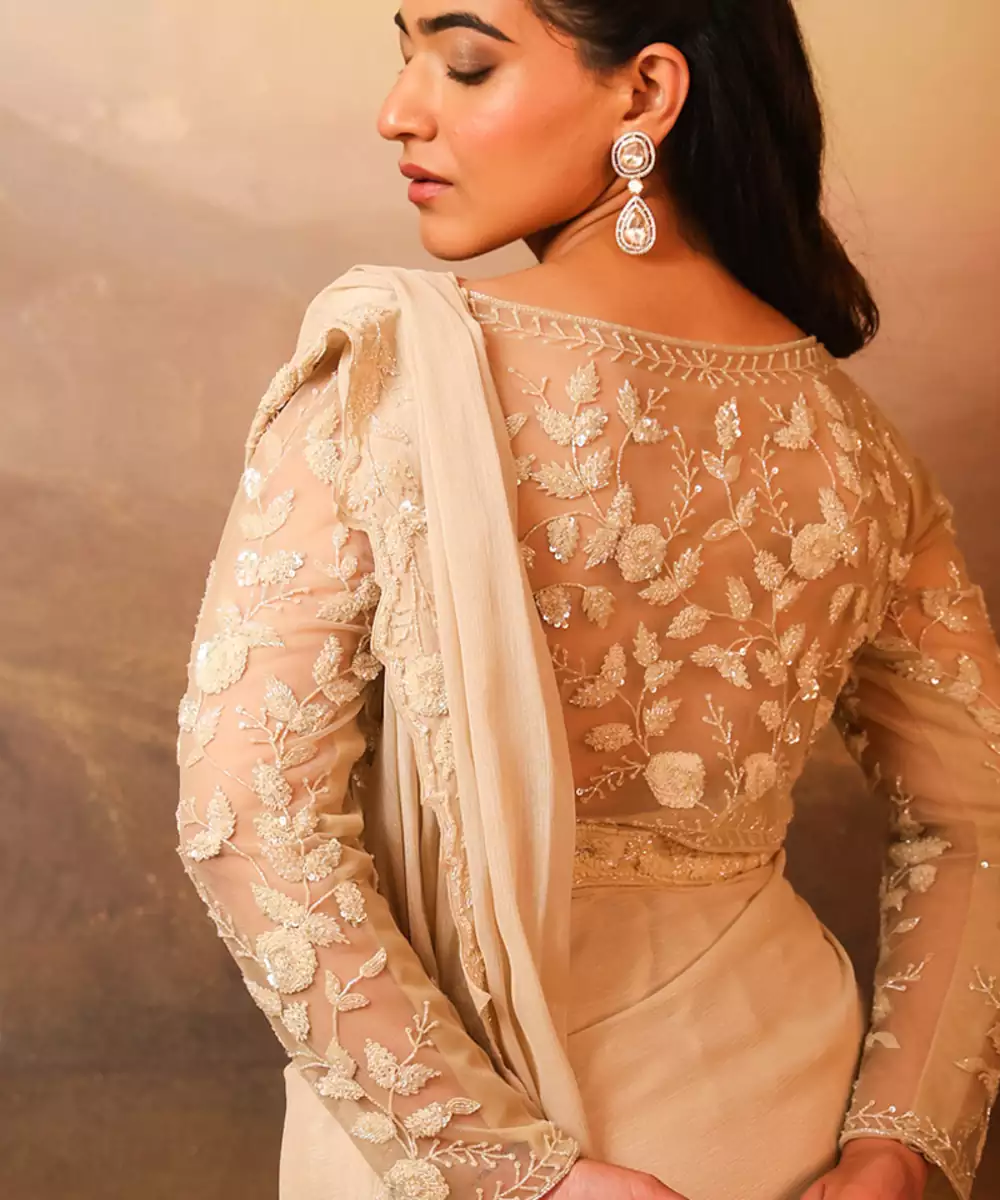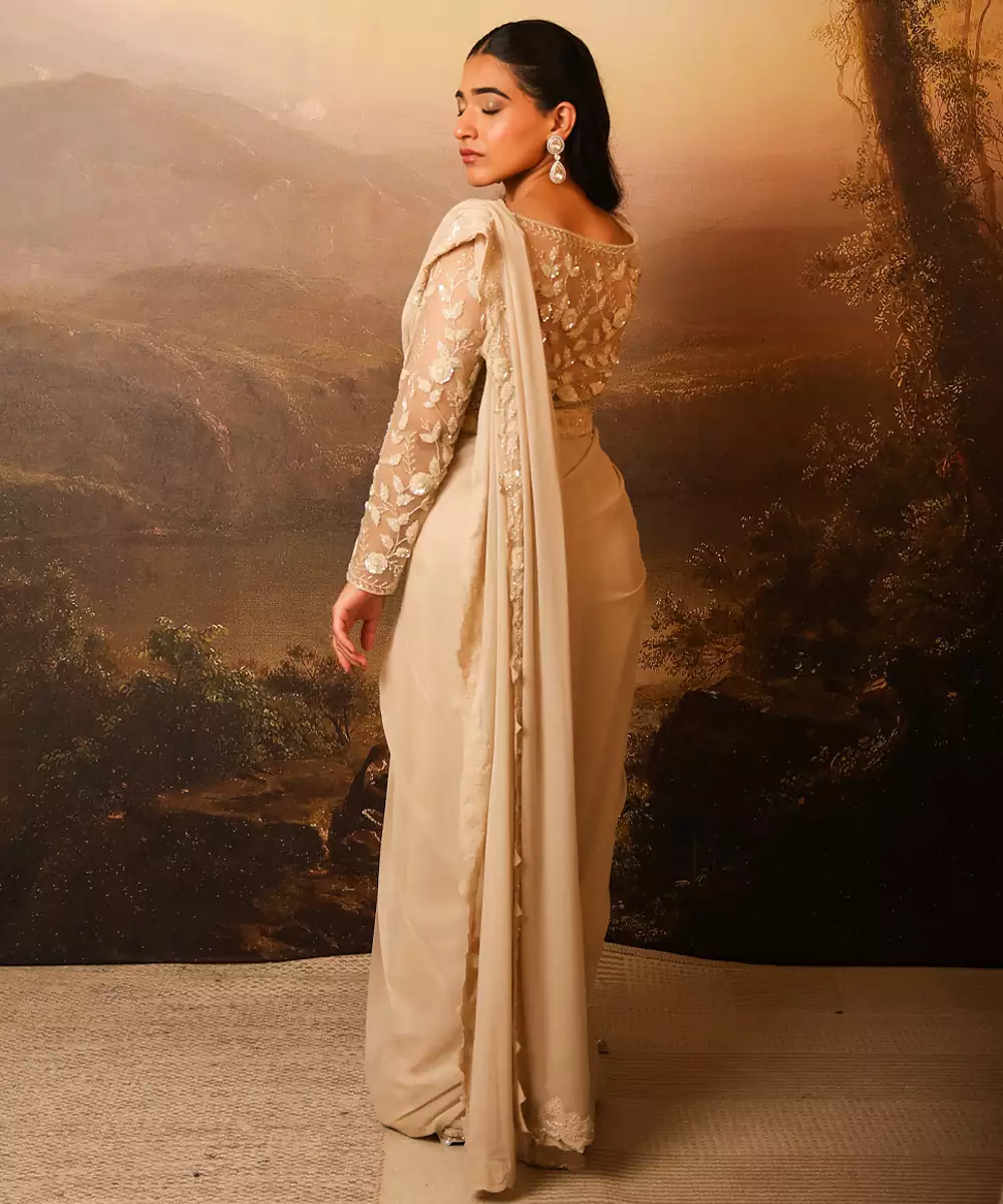 This Ivory Embroidered Net Saree Showcases Delicate Craftsmanship With Intricate Detailing Across Its Sheer, Lightweight Fabric. The Elegant Ivory Hue Adds A Timeless Charm, While The Fine Embroidery Enhances Its Luxurious Appeal. Perfect For Weddings, Festive Occasions, And Evening Events, It Pairs Beautifully With Ornate Jewelry For A Graceful, Sophisticated Look.