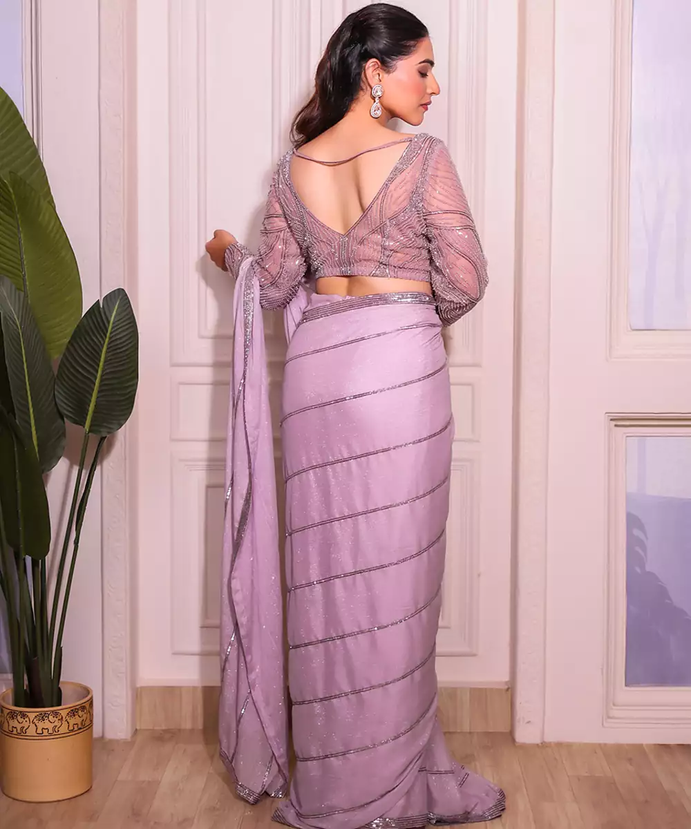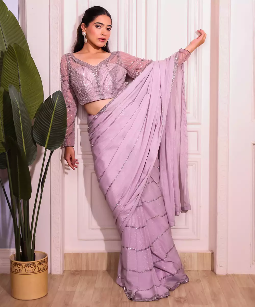 This Lavender Plain Net Saree Brings A Soft, Dreamy Elegance With Its Sheer, Lightweight Fabric. The Delicate Net Drapes Beautifully, Creating A Graceful And Feminine Silhouette. Ideal For Parties, Festive Events, And Evening Occasions, It Pairs Perfectly With Embellished Blouses And Subtle Accessories For A Refined, Charming Look.