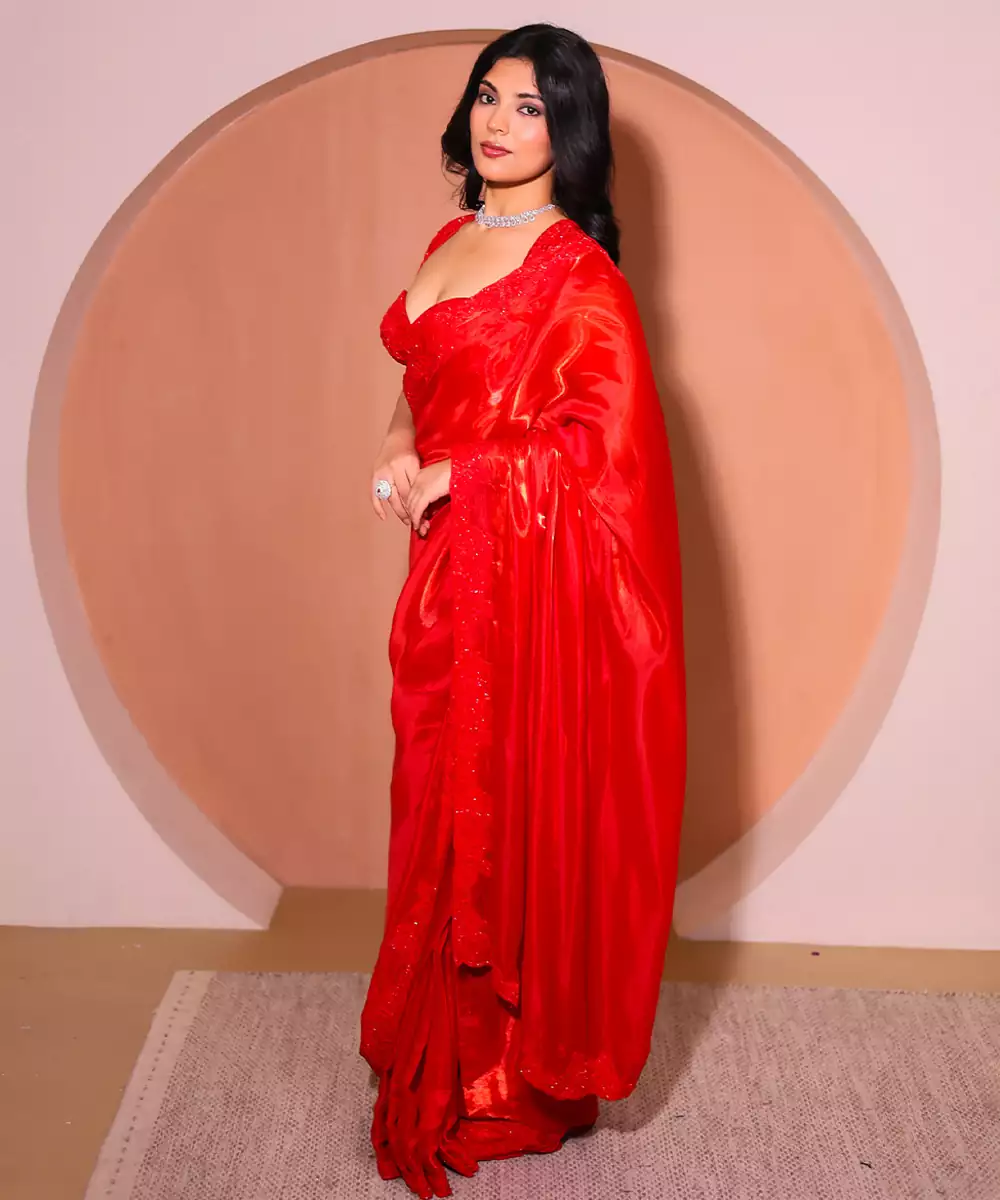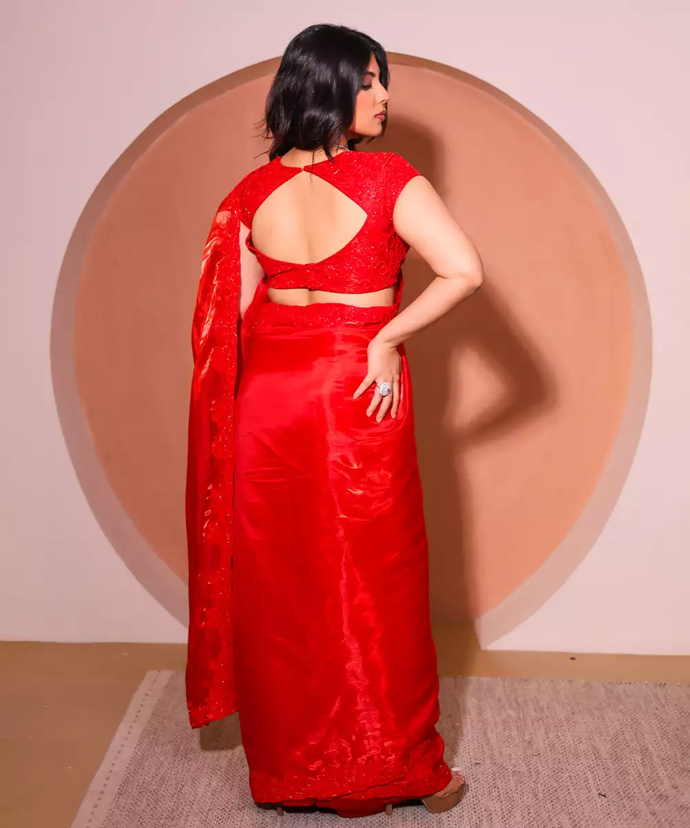 This Red Plain Organza Saree Exudes Elegance With Its Crisp Texture And Subtle Sheen. Crafted From Premium Organza, It Offers A Structured Yet Graceful Drape That Enhances Any Look. Perfect For Festive Events, Parties, Or Receptions, It Pairs Beautifully With Statement Blouses And Accessories For A Bold, Timeless Appearance.