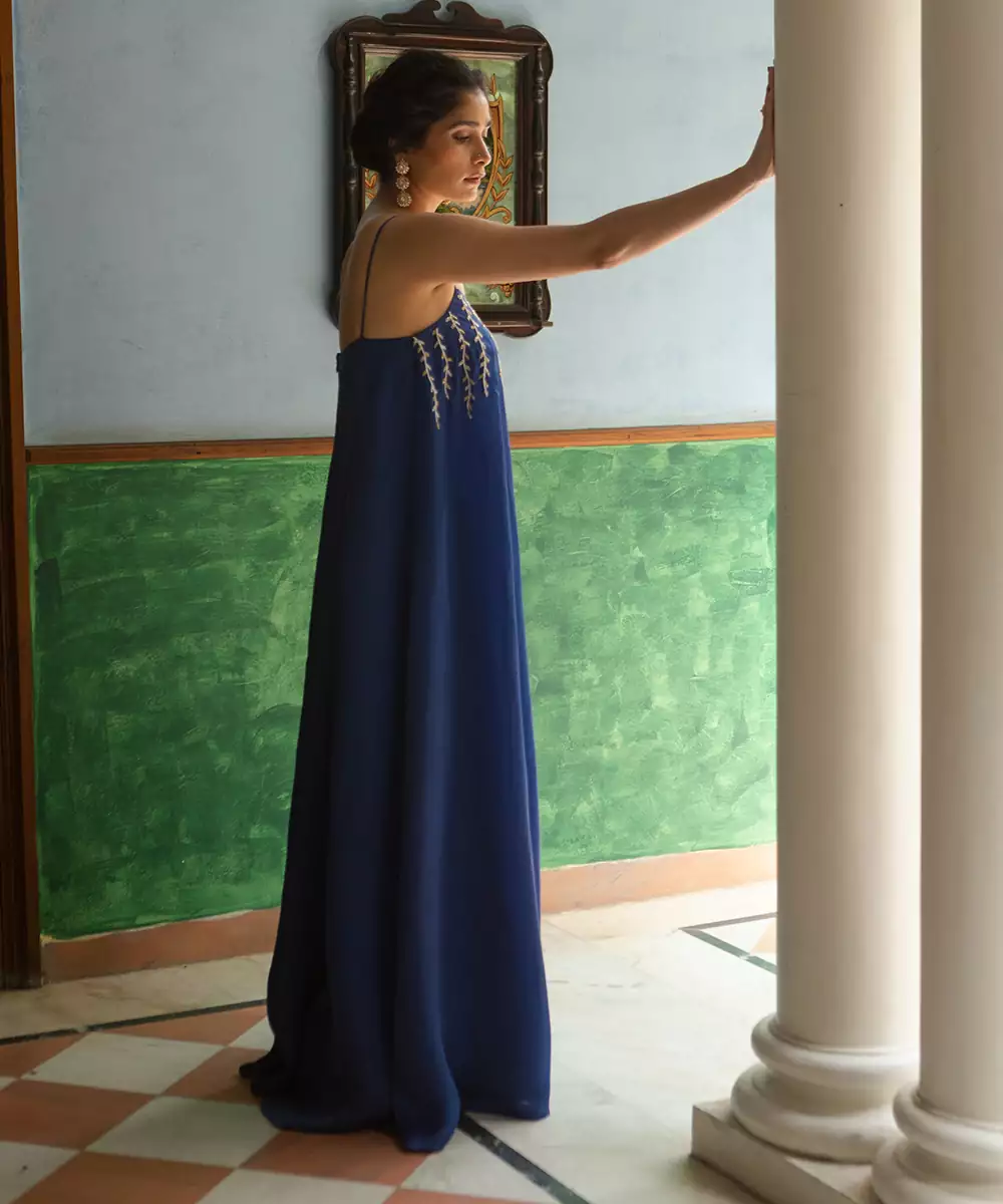 Blue Leaf Cutdana Line Embroidered Flared Jumpsuit With Side Pocket.