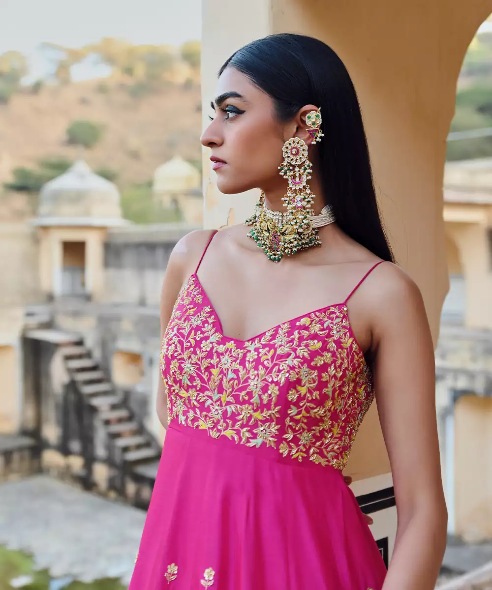 Hot Pink Spaghetti Floral Jaal Yoke Embroidered 16 Kali Floor Length Anarkali With Dupatta Colour: Hot Pink Fabric: Silk Components : 1 Anarkali / 1 Dupatta