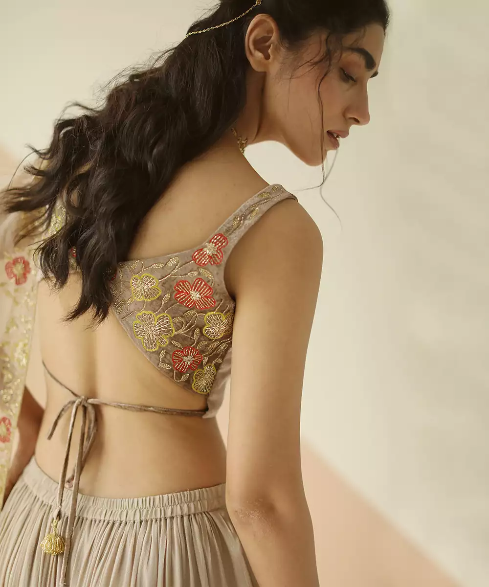 The Ash Grey Sharara Set, The Blouse In Velvet Handcrafted With Floral Foliage In Gold Sequin & Yellow & Red Thread Paired With A Sharara & Embroidered Organza Dupatta.