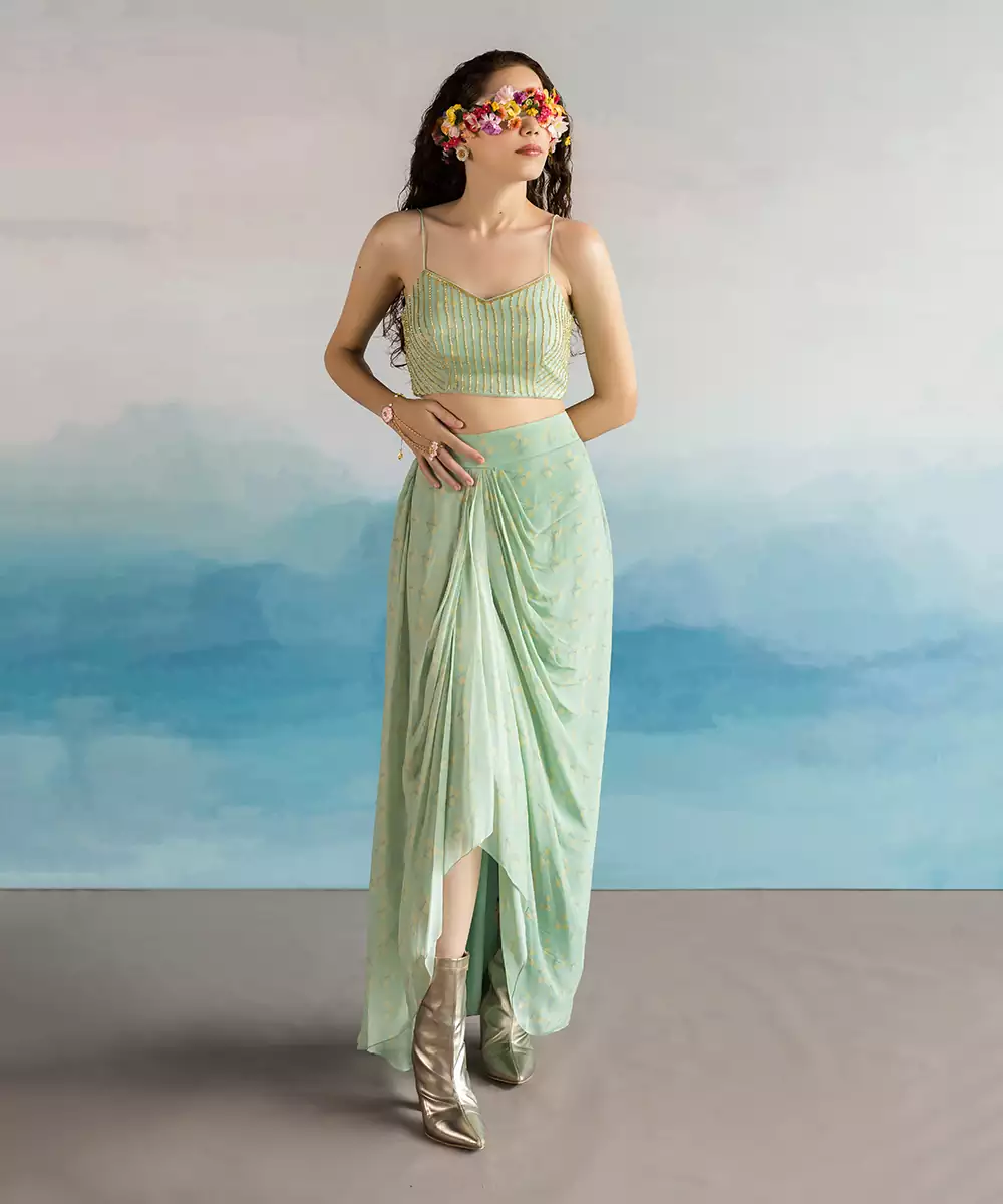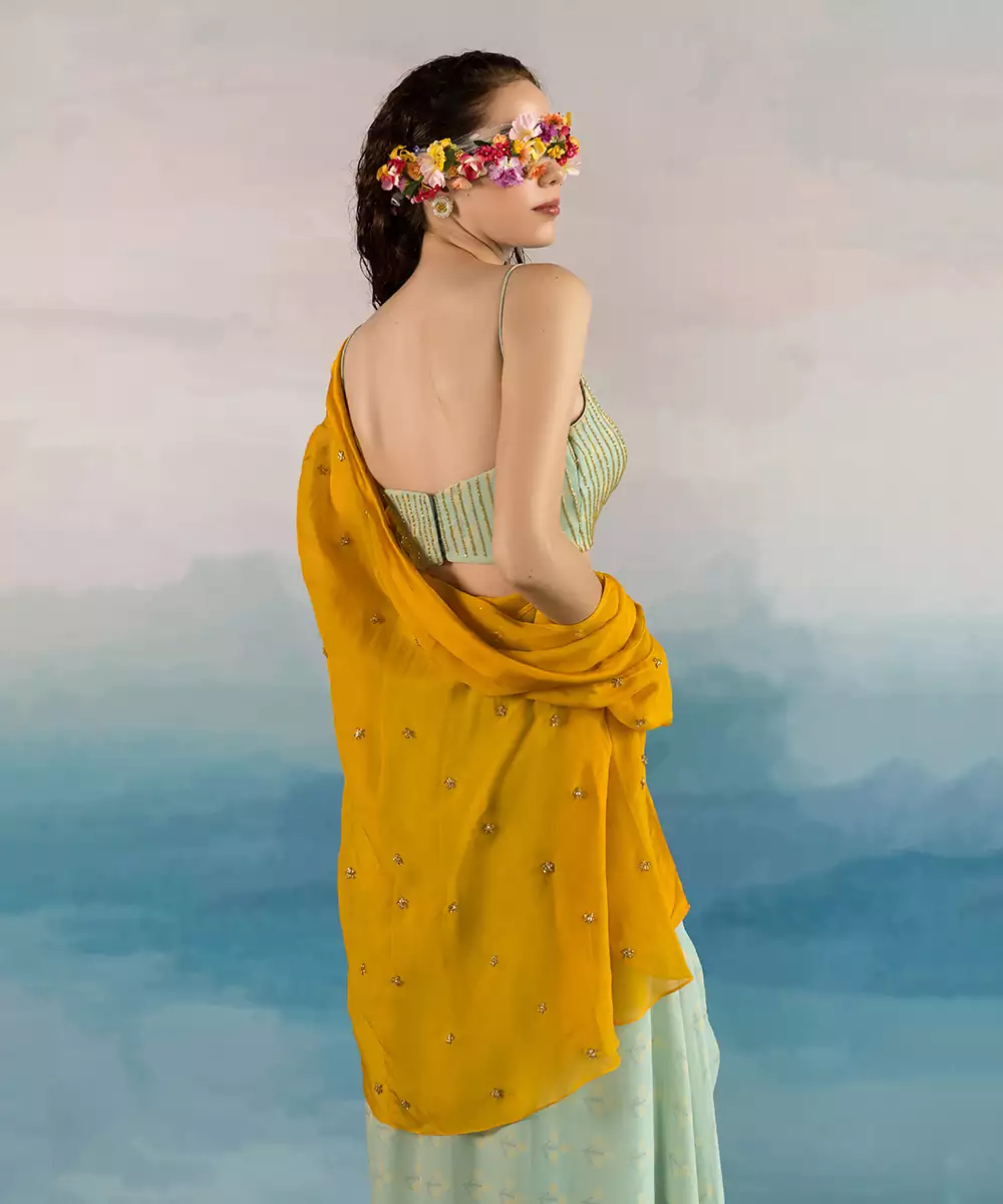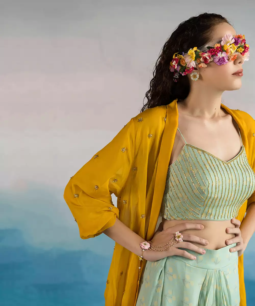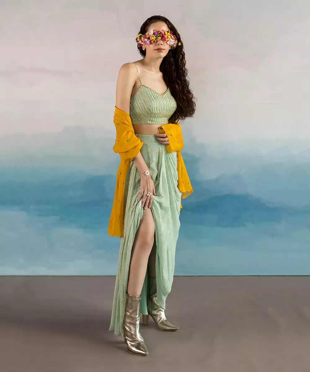 Mint Blue Printed Line Embroidered Bralette With Cowl Skirt And Loose Yellow Embroidered Chitta Work Jacket .