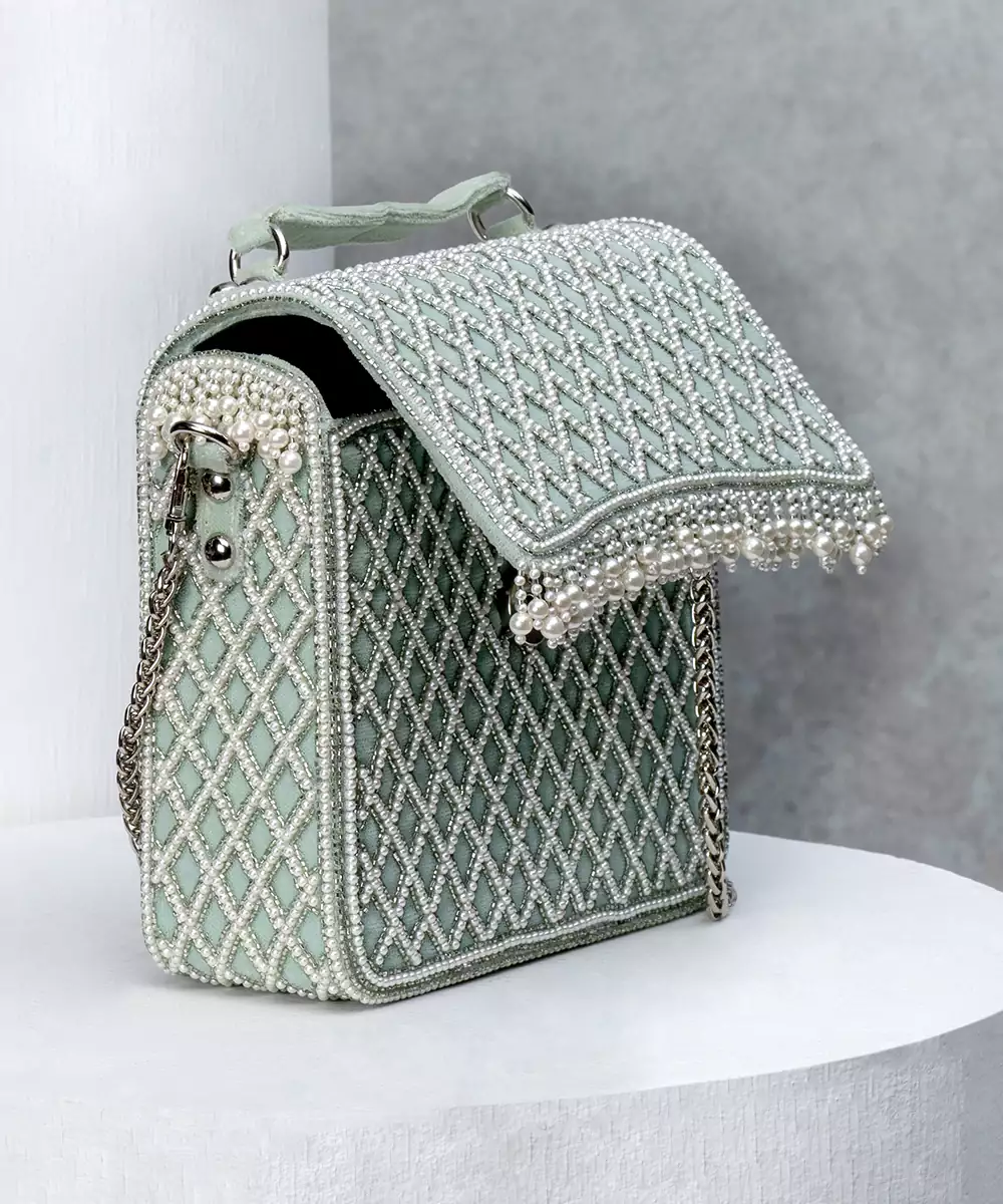 The Natali Clutch Is A Flap Box Clutch With A Sculptural Shape Defined By Its Pearl And Cut Dana Geometric Embroidery. Striking The Perfect Balance Between Ethnic And Contemporary, This Distinctive Clutch Features A Top Handle, A Pearl Beaded Chain, As Well As A Long Cross Body Metal Strap. In Velvet Fabric, It Is Finished With Subtle Trimmings On The Sides Along With Sparkling Tassels Lining The Front Of The Flap. No Matter The Occasion Or Outfit, This Distinctive Bag Reimagines Ethnic Embroidery Into A Contemporary Piece That Makes For A Flawless Stand Out Accessory.
