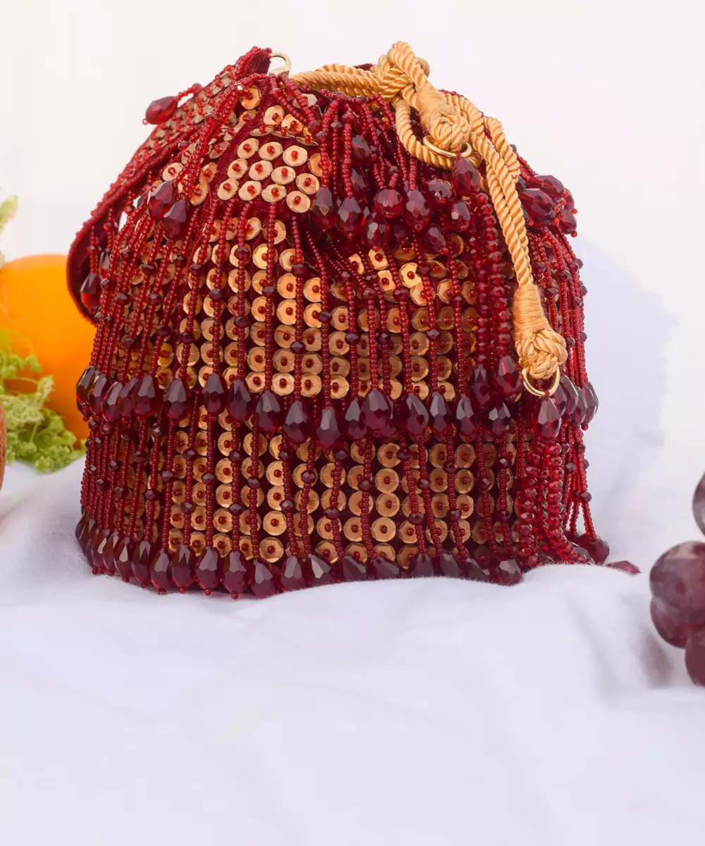 The Shayna Bucket Bag Is A Drawstring Bag With A Round Base. Laden With Tiers Of Hand Embroidered Bead And Crystal Tassels That Wrap Around The Bag, The Base Is Bedecked With Sequin Embroidery On Velvet Fabric. Chic, Sophisticated, And Easy To Wear.