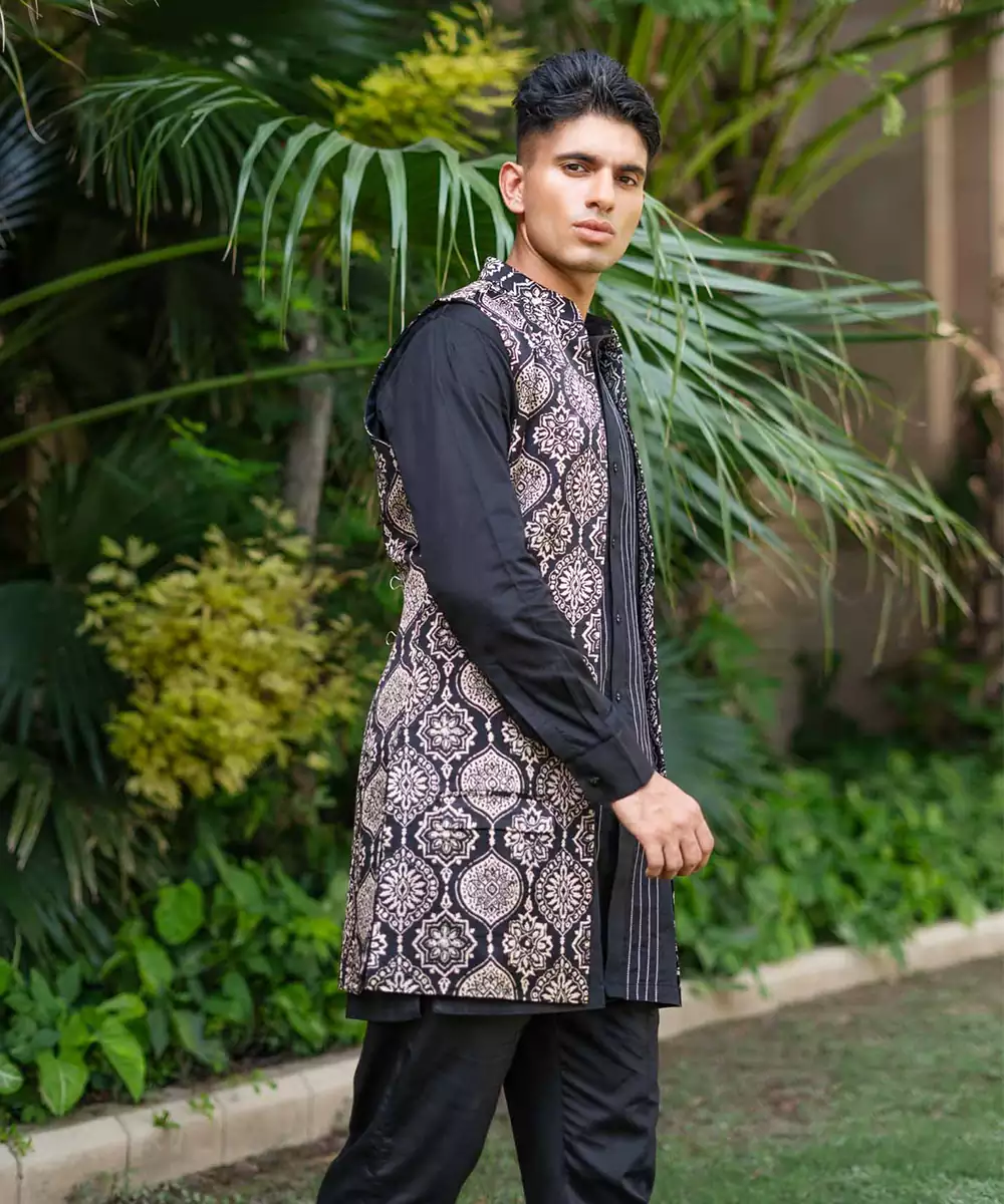 This Jacket Is Made Of Hand Made Mashroo Silk And Hand Block Ajrakh Printed By The Original Artisans Of Ajrakh. Since The Fabric Is Handmade Mashroo Silk, It Has A Luxurious Shine. The Hand Block Printed Ajrakh Design Adds To Its Remarkable Aesthetic. It Is Lined With Pure Cotton. It Has A Mandarain Collar, Front Open Placket,Front Pocket, And A Chest Pocket.