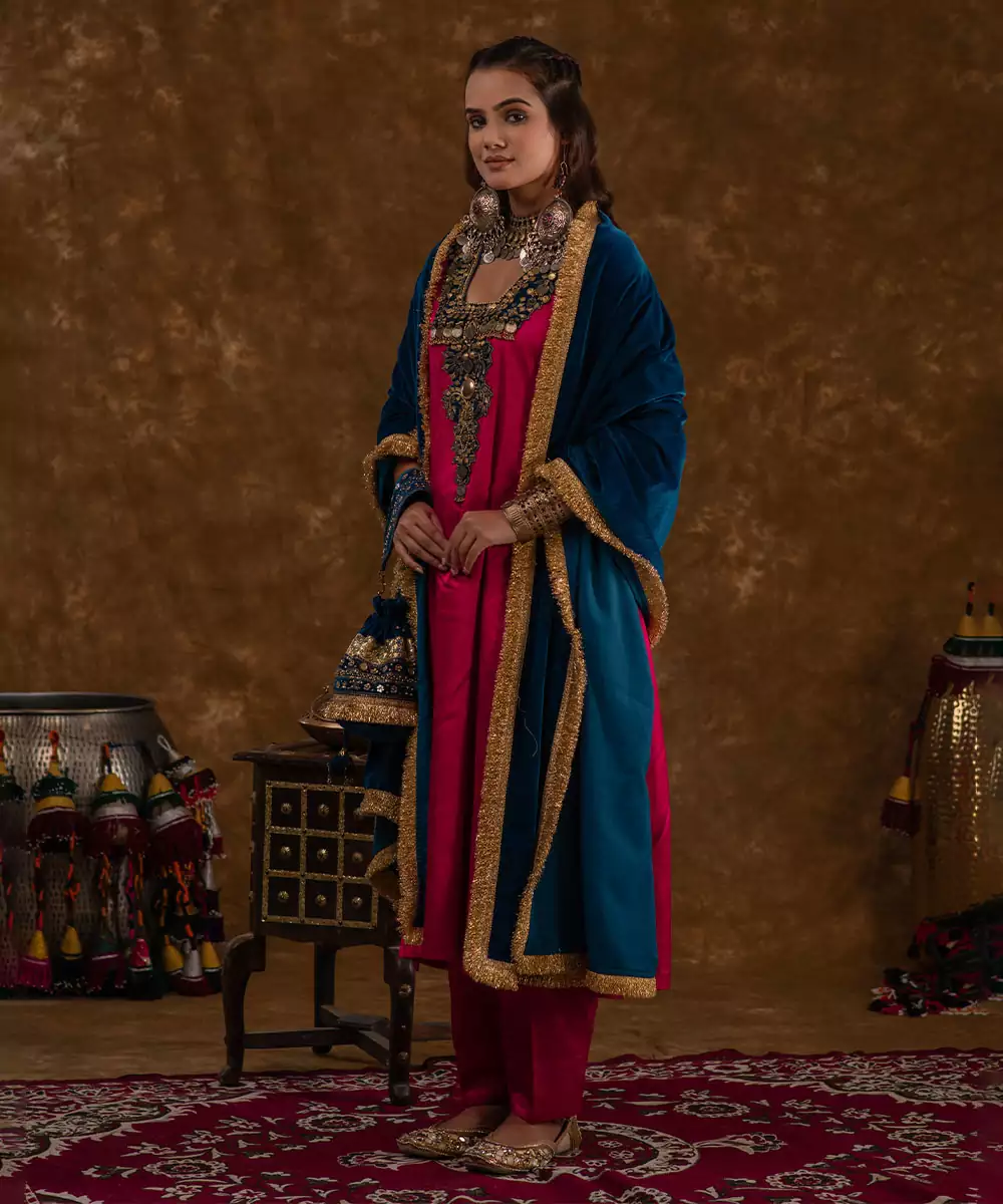 This Exquisite Ensemble Features A Striking Hot Pink Base Adorned With A Rich Teal Blue Patch, Meticulously Hand Embroidered With Delicate Coin Work. The Suit Set Comes With An Elasticated Salwar For Comfort And Practicality, Along With Thoughtfully Added Pockets. The Contrasting Velvet Patch Adds A Luxurious Touch, Complemented By A Velvet Odhni Adorned With Hand Picked Kiran Lace, Completing The Look With Finesse.