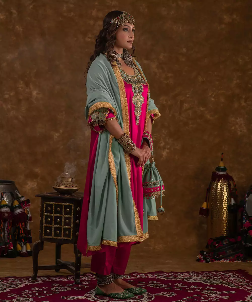 This Exquisite Ensemble Features A Striking Hot Pink Base Adorned With A Rich Sea Green Patch, Meticulously Hand Embroidered With Delicate Coin Work. The Suit Set Comes With An Elasticated Salwar For Comfort And Practicality, Along With Thoughtfully Added Pockets. The Contrasting Velvet Patch Adds A Luxurious Touch, Complemented By A Velvet Odhni Adorned With Hand Picked Kiran Lace, Completing The Look With Finesse.