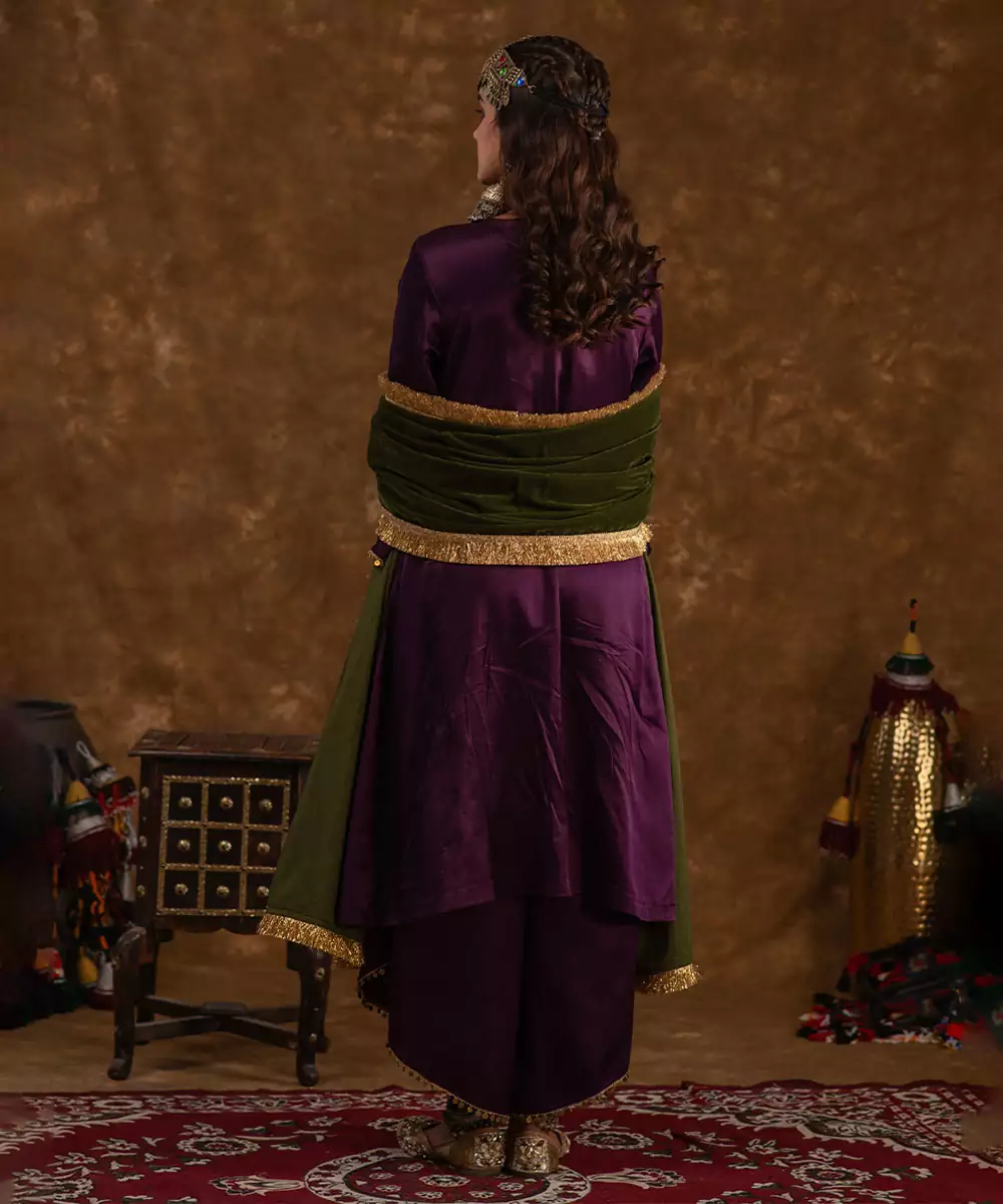 The Kurta Is Highlighted By A Contrast Olive Green Velvet Patch, With The Handwork Done , Providing A Touch Of Opulence. The Outfit Is Completed With Wrap Palazzo Pants Featuring Delicate Lace Detailing. To Enhance The Look, Our Velvet Odhni, Complements Shaira With Its Lace Trims And Sophisticated Design. Shaira Is A Timeless Piece That Blends Tradition With Modern Design.