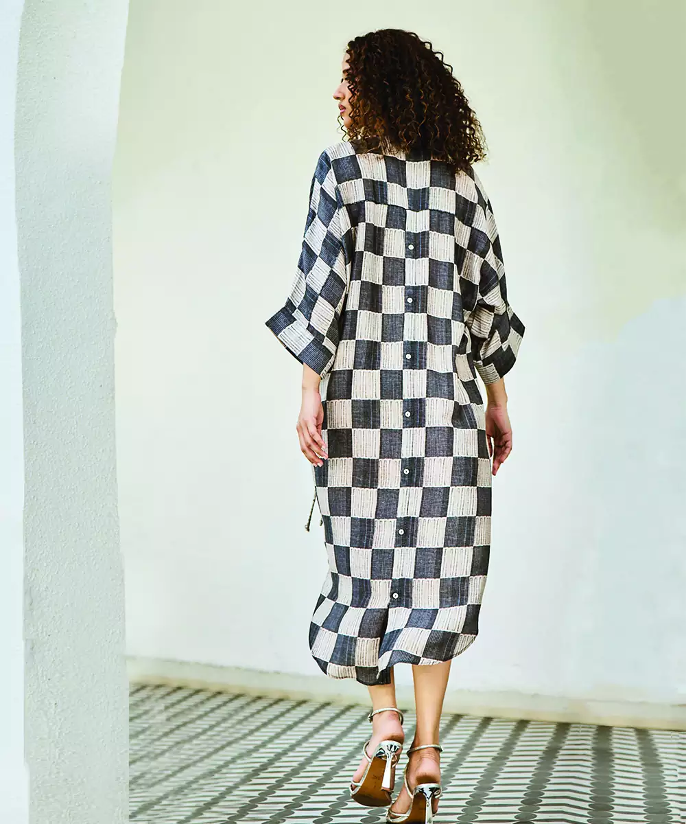This Charcoal Linen Dress Features Elegant Prints That Add Depth To Its Understated Tone. Crafted From Breathable Fabric, It Offers A Comfortable And Flattering Fit. Perfect For Casual Outings Or Daywear, It Pairs Effortlessly With Simple Accessories For A Chic And Contemporary Style.