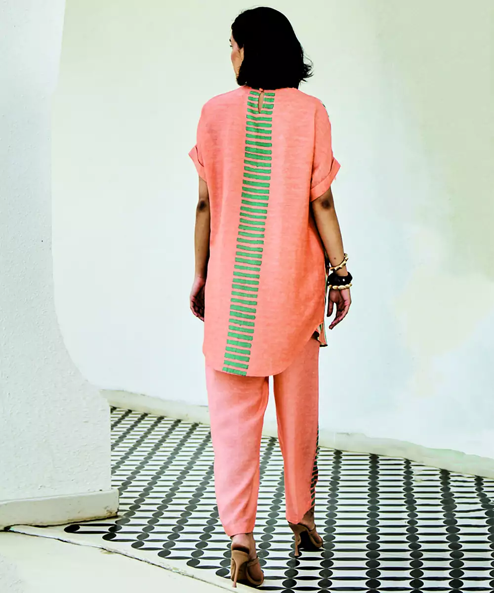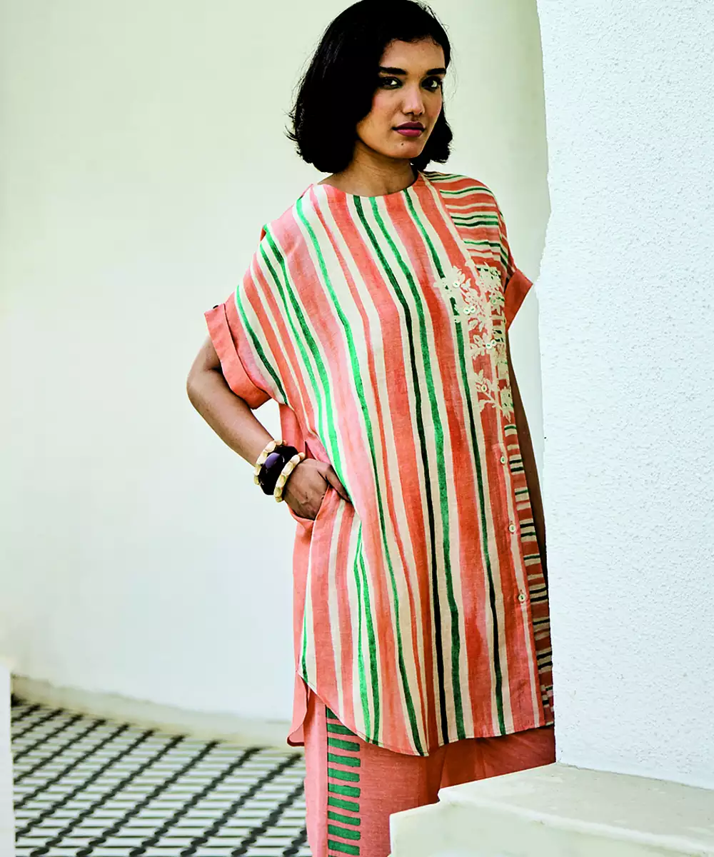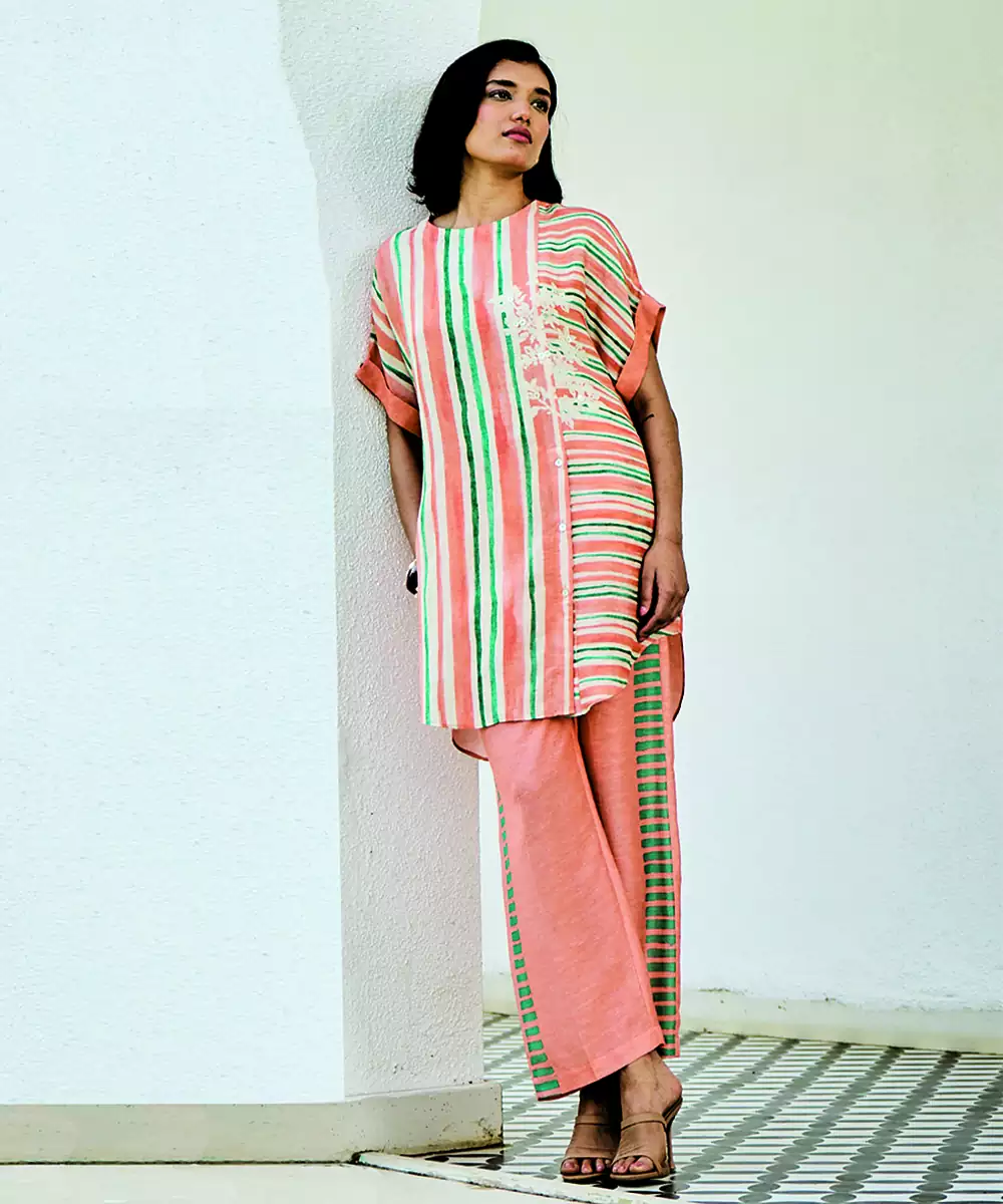 This Peach Linen Kurta Set Showcases Soft Prints That Complement Its Soothing Tone. The Breathable Fabric Ensures Comfort, While The Relaxed Silhouette Enhances Its Appeal. Ideal For Daytime Outings, It Pairs Effortlessly With Subtle Accessories For A Graceful And Stylish Appearance.