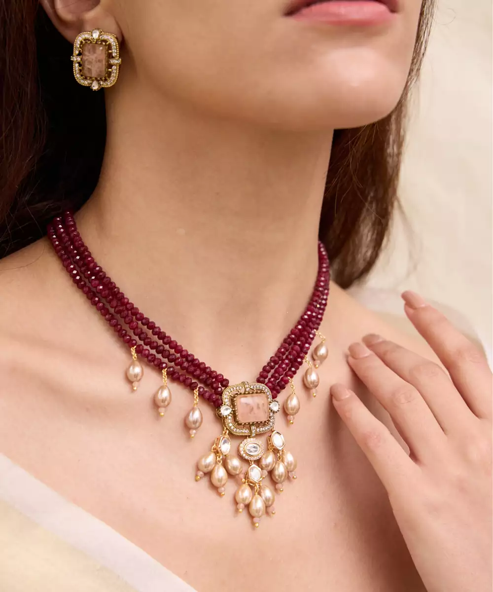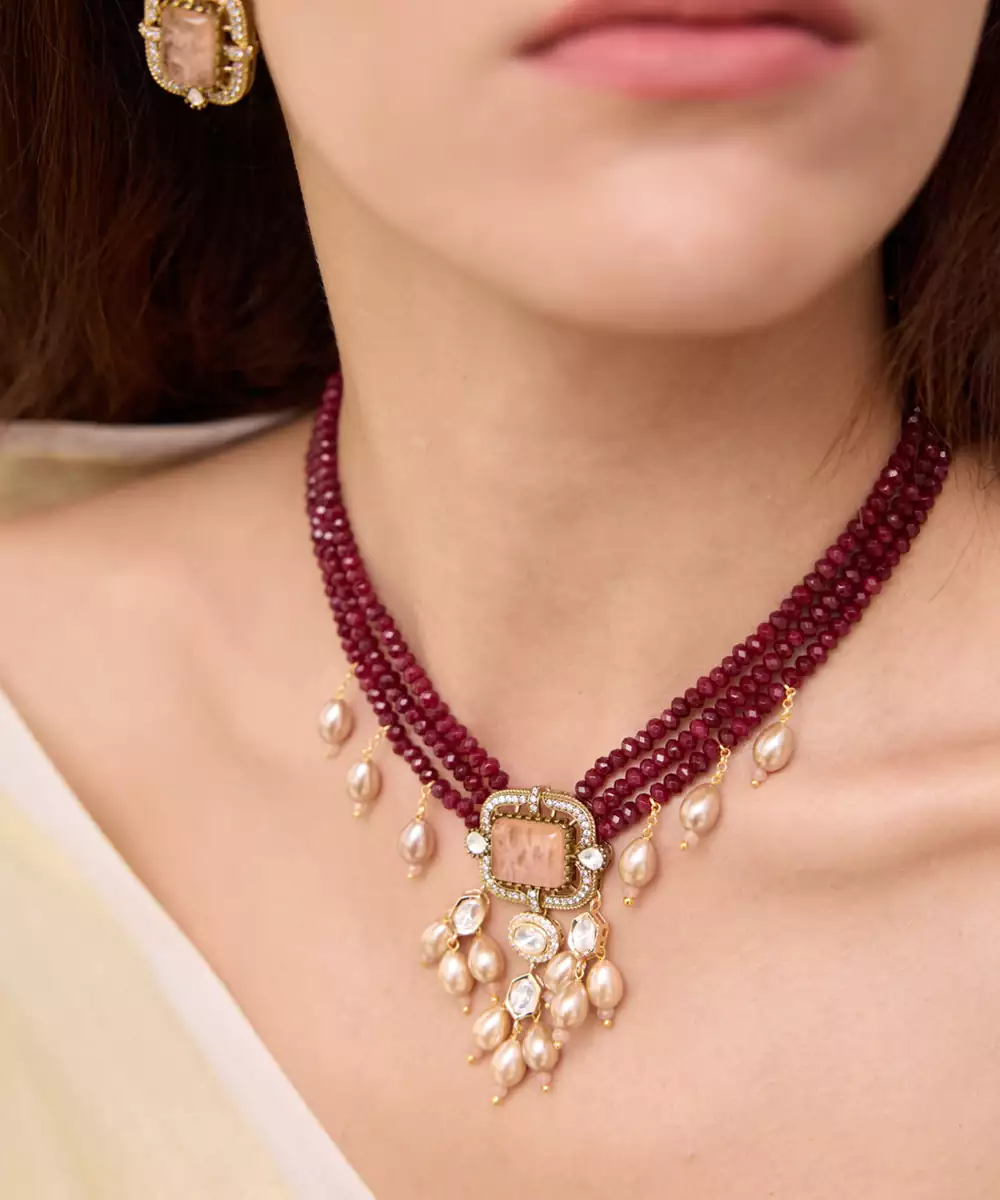 This Maroon Beaded Necklace Set Comes With Matching Earrings And A Dramatic Floral Pendant Embellished With Kundan And Pearls. A Vibrant, Regal Ensemble Ideal For Festive Occasions And Ethnic Celebrations.
