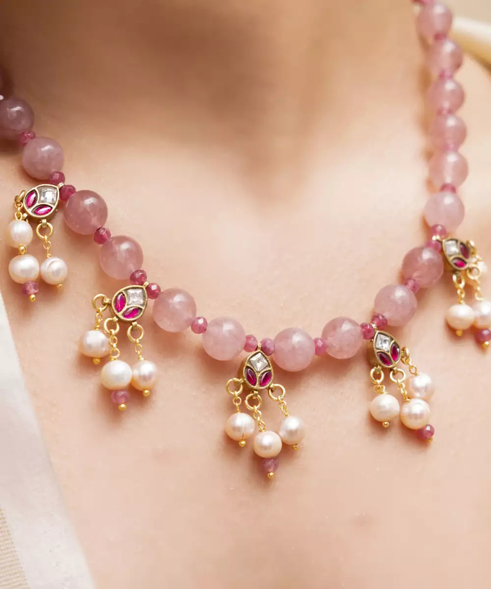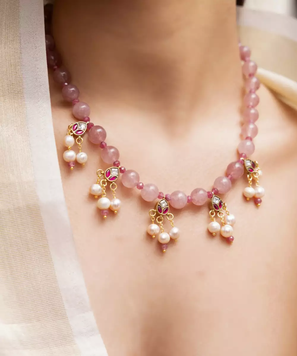A Pastel Pink Necklace Adorned With Floral Charms And Pearl Drops, Radiating Softness And Femininity. A Beautiful Pick For Bridesmaids Or Day To Evening Festive Dressing.