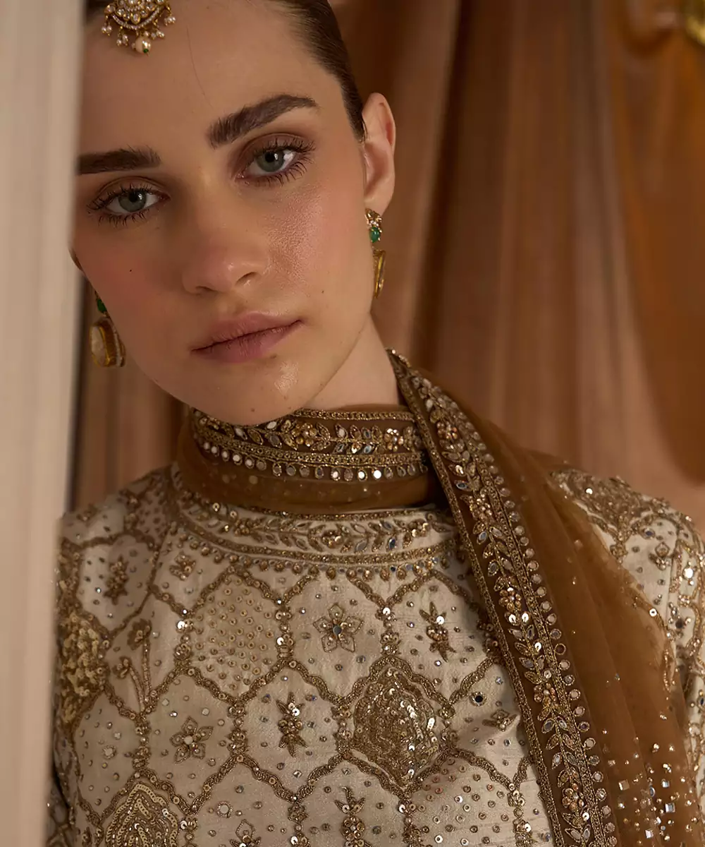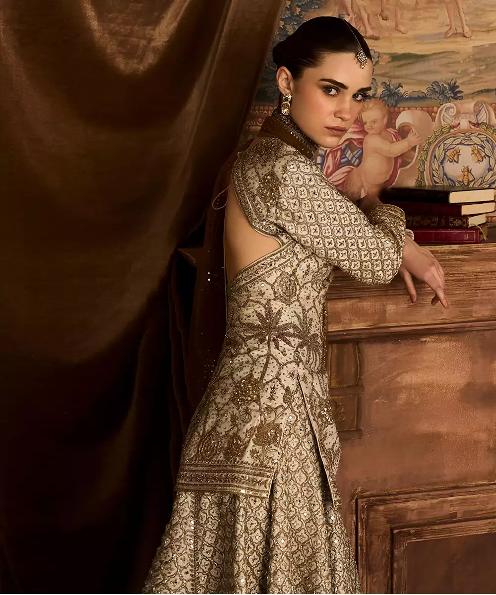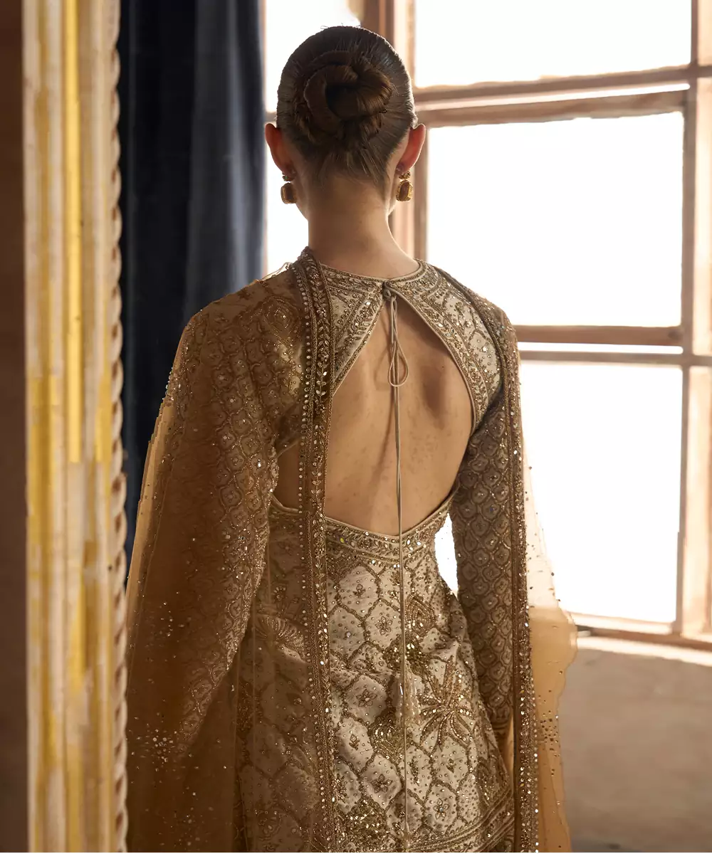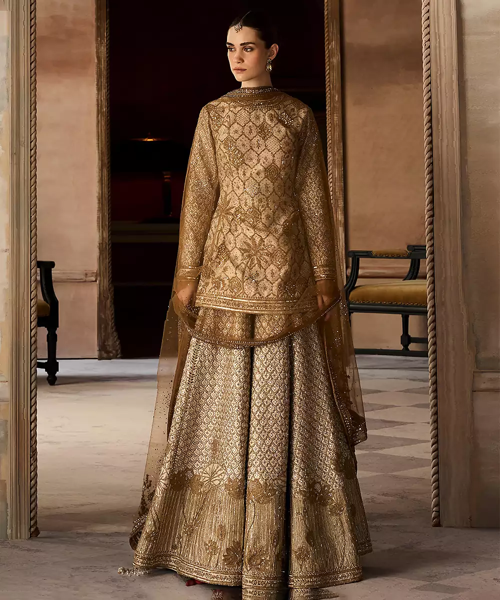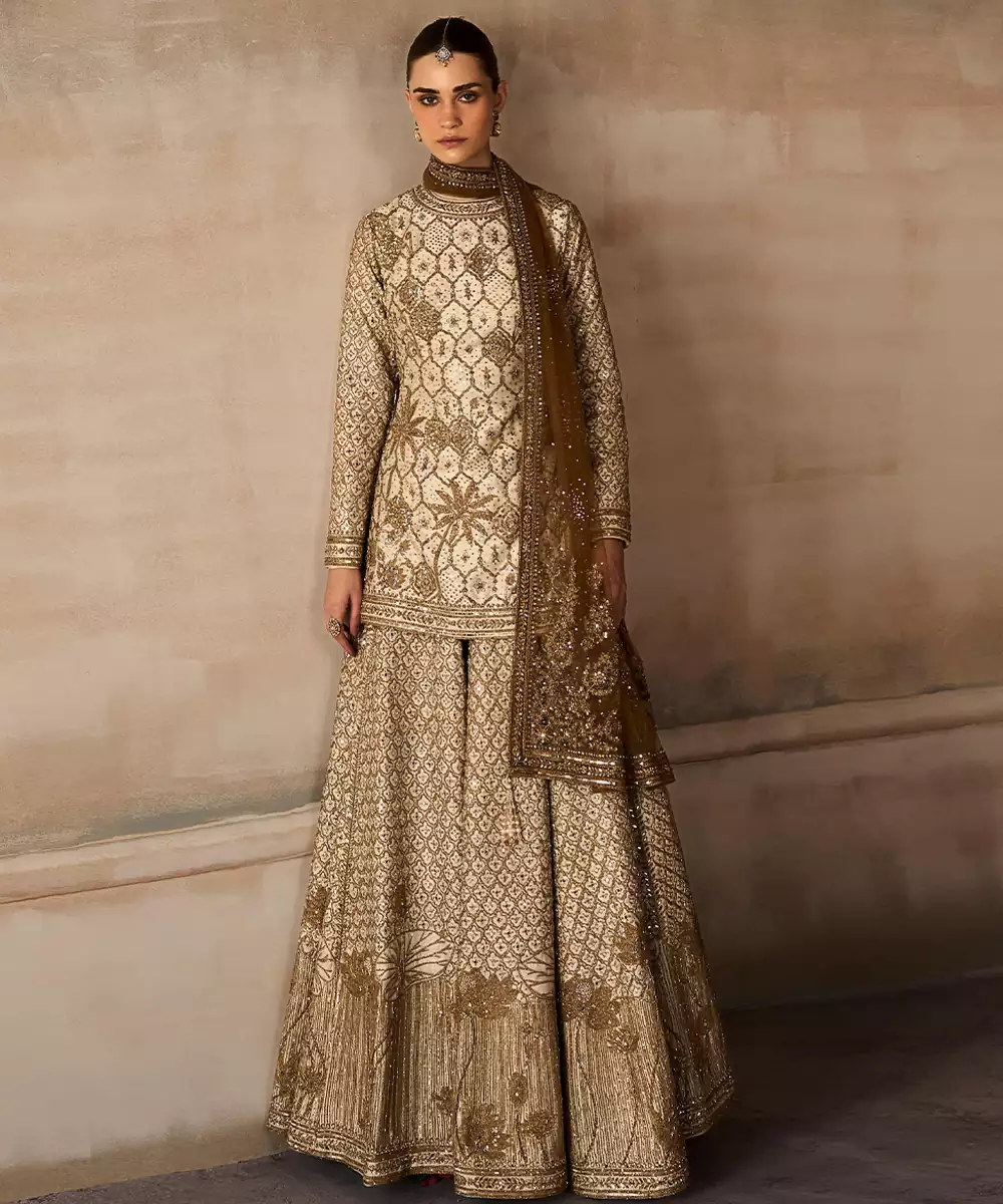 This Ekru Gold Embroidered Rambagh Silk Sharara Set Exudes Understated Luxury With Its Soft Hue And Intricate Gold Detailing. The Rich Silk Fabric Adds Depth And Elegance, While The Flared Sharara Enhances Movement. Perfect For Weddings And Festive Occasions, It Offers A Refined Blend Of Tradition And Contemporary Grace.