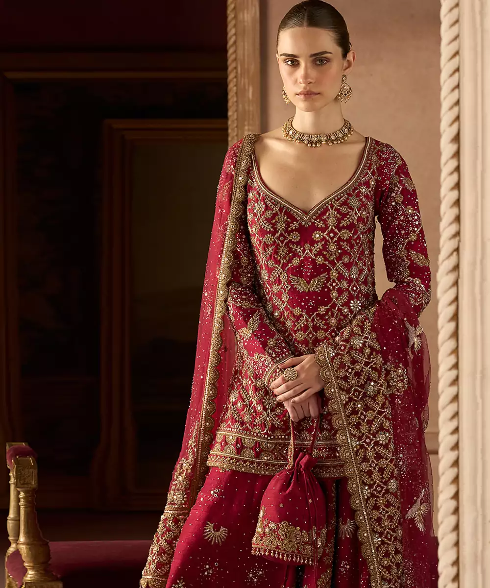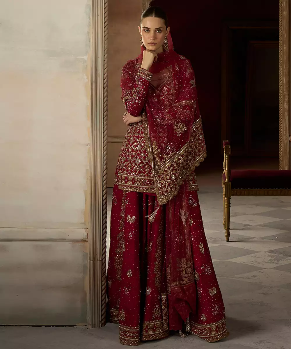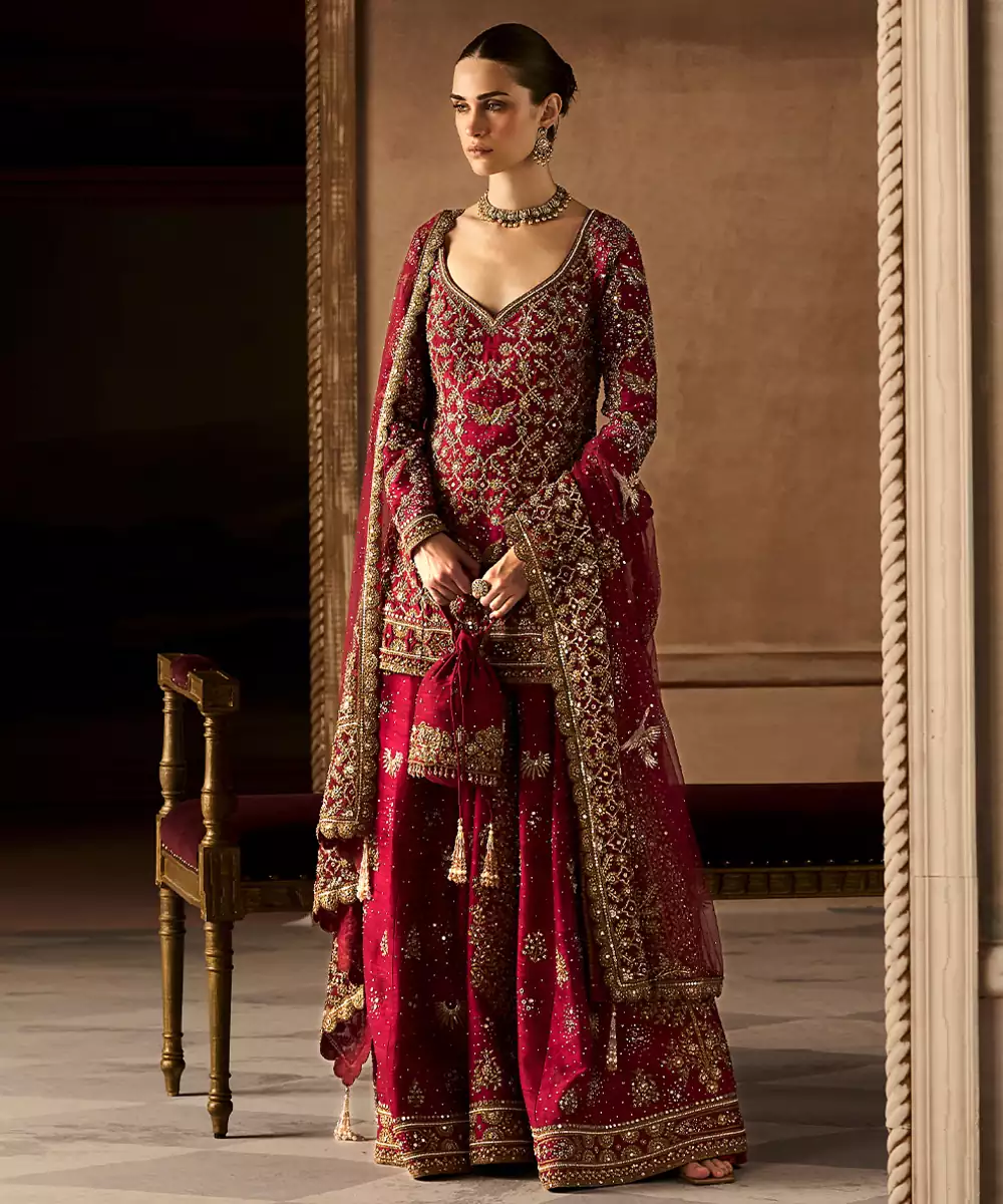Scarlet Red Embroidered Rambagh Silk Sharara Set