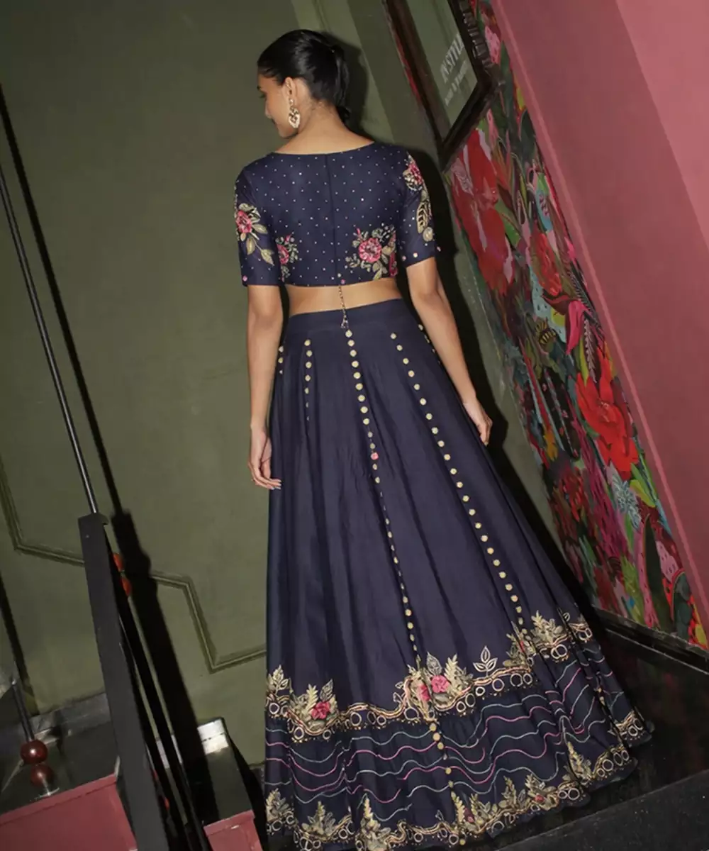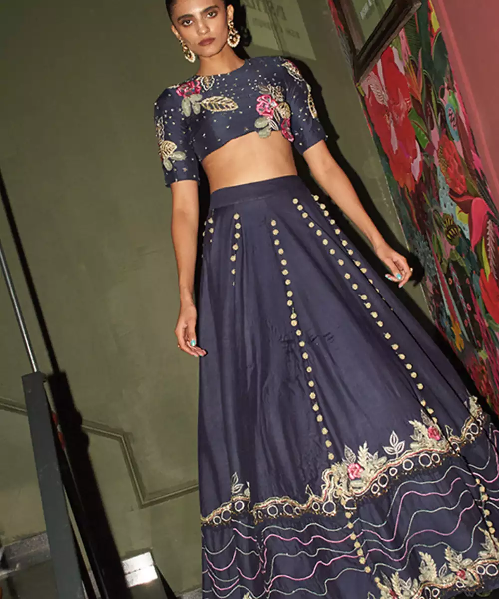 Blue Chanderi Lehenga Sets Like This Elegant Embroidered Ensemble Bring Together Contemporary Style And Traditional Craftsmanship. Crafted From Lightweight Chanderi Fabric, This Designer Lehenga Set Features Delicate Floral Embroidery That Adds Texture, Color, And Refined Detail To The Deep Blue Tone. The Blouse Is Beautifully Designed With Embroidered Floral Motifs That Enhance Its Modern Silhouette While Maintaining A Graceful Ethnic Appeal.