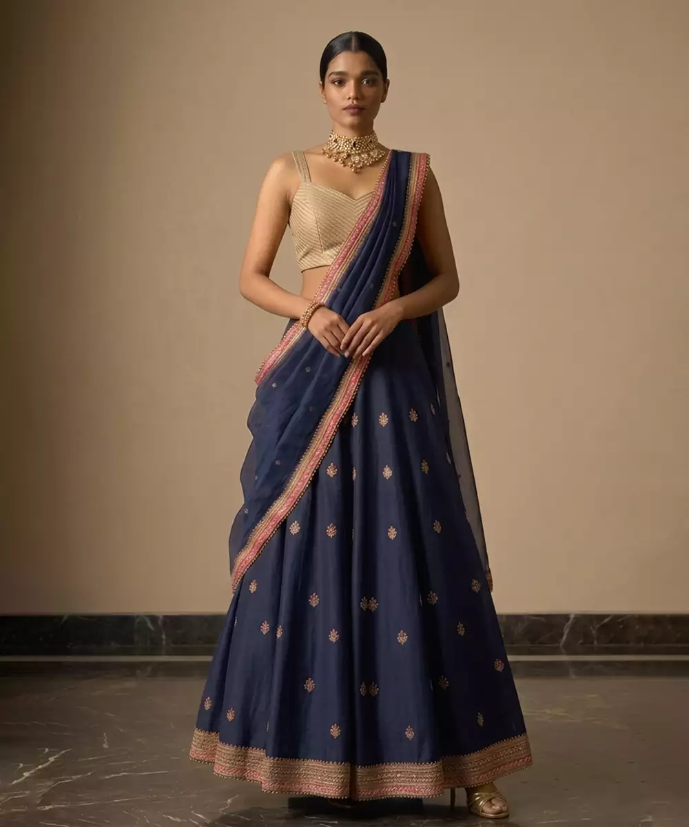 Navy Blue Embroidered Raw Silk Lehenga Set