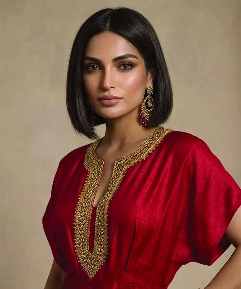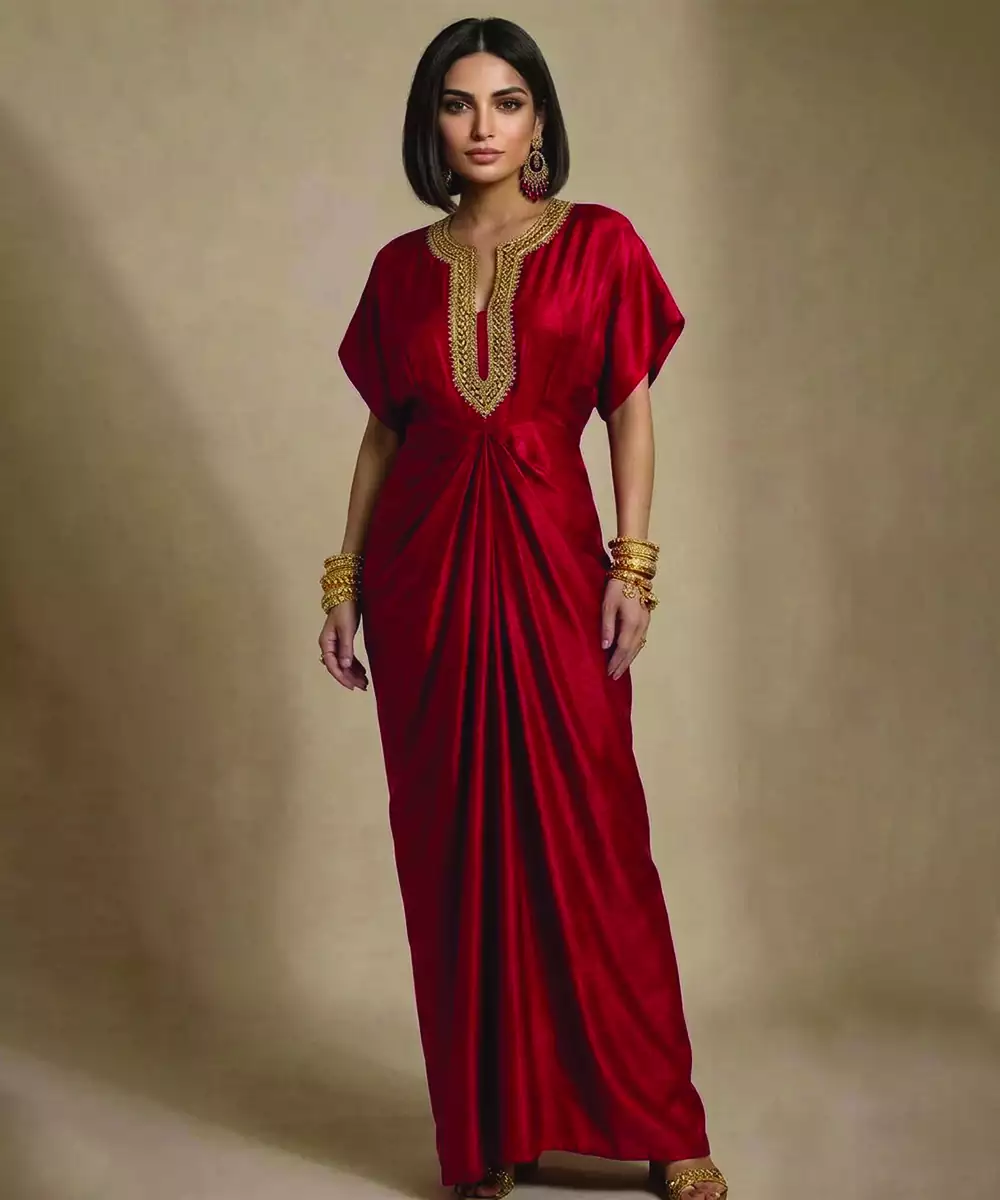 This Ruby Red Kaftan In Rich Raw Silk Exudes Timeless Charm With Its Detailed Embroidery. The Flowy Silhouette Ensures Ease Of Movement While Maintaining A Regal Appeal. Perfect For Festive Occasions Or Evening Events, It Pairs Beautifully With Bold Jewelry For A Striking And Sophisticated Ensemble.