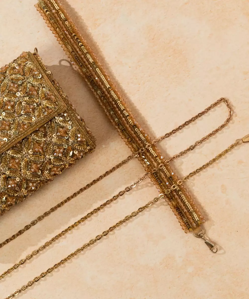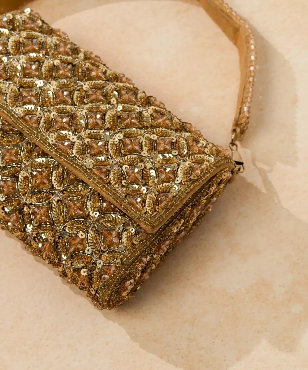 This Gold Silk Sequin Embroidered Clutch Is A Dazzling Accessory That Adds Glamour To Any Ensemble. Crafted From Premium Silk, It Features Intricate Sequin Embroidery That Catches The Light Beautifully. Compact Yet Functional, With A Secure Closure, It Is Perfect For Weddings, Parties, And Festive Occasions, Complementing Both Traditional And Contemporary Outfits.