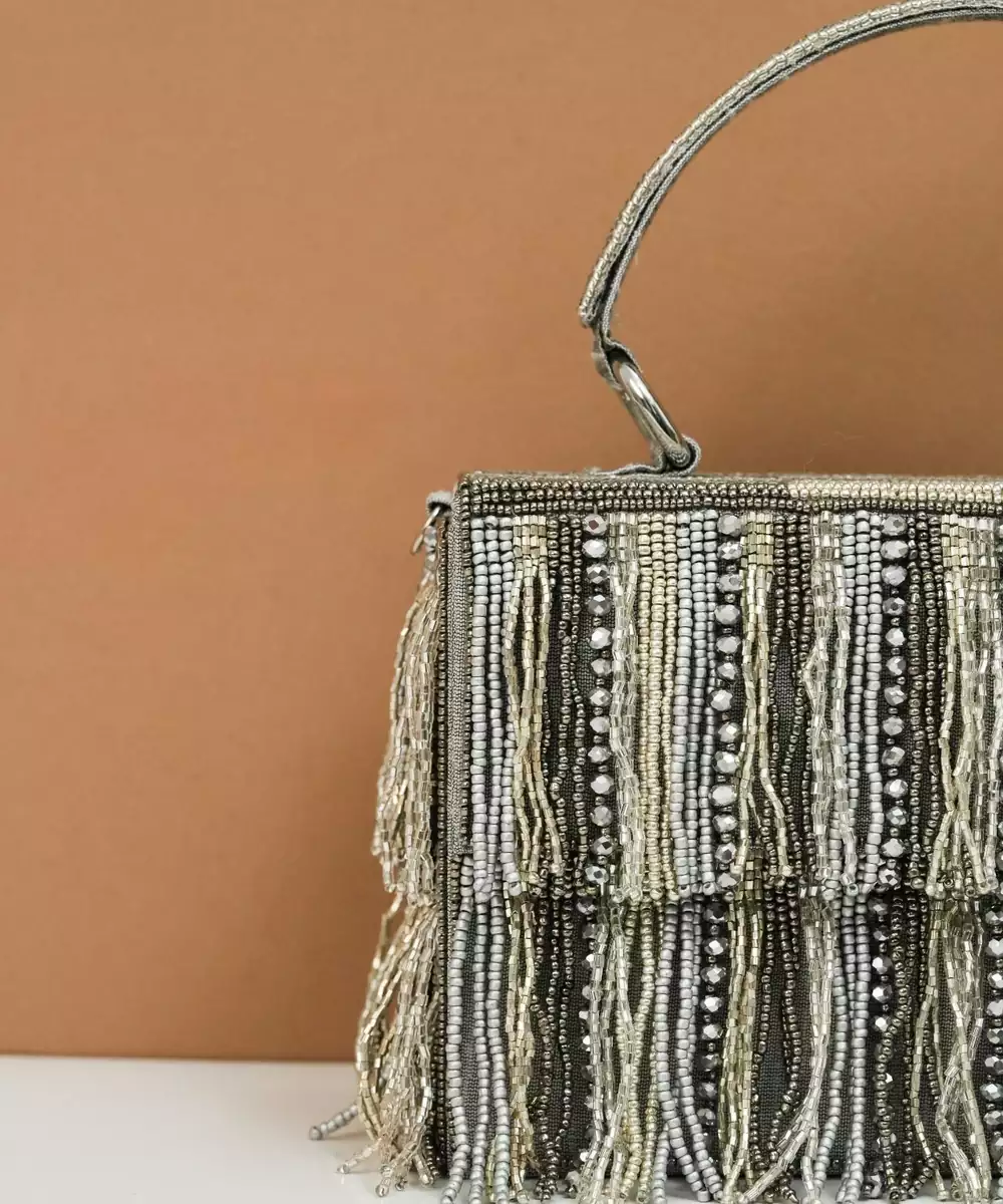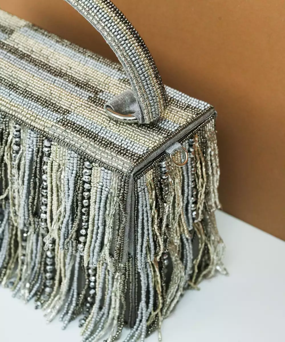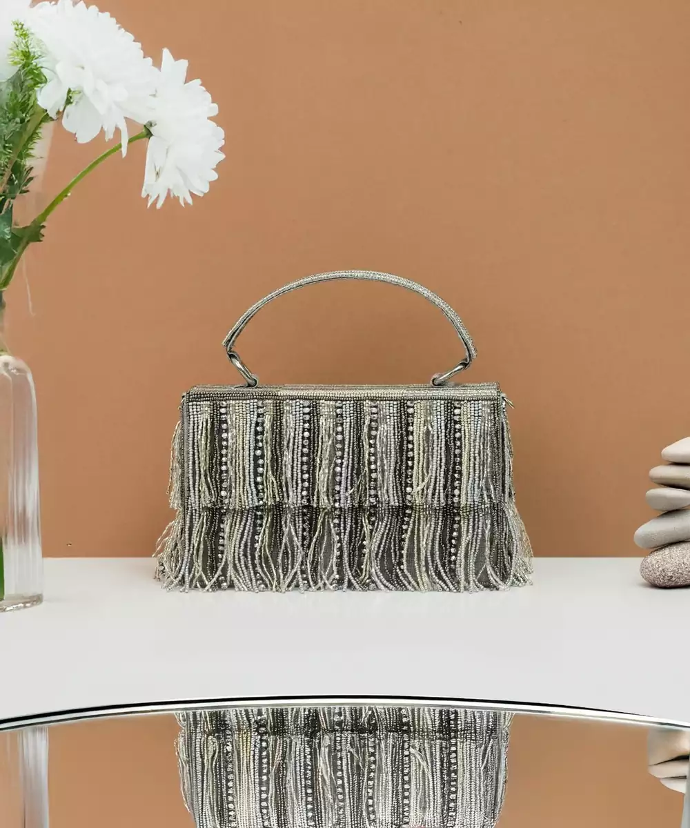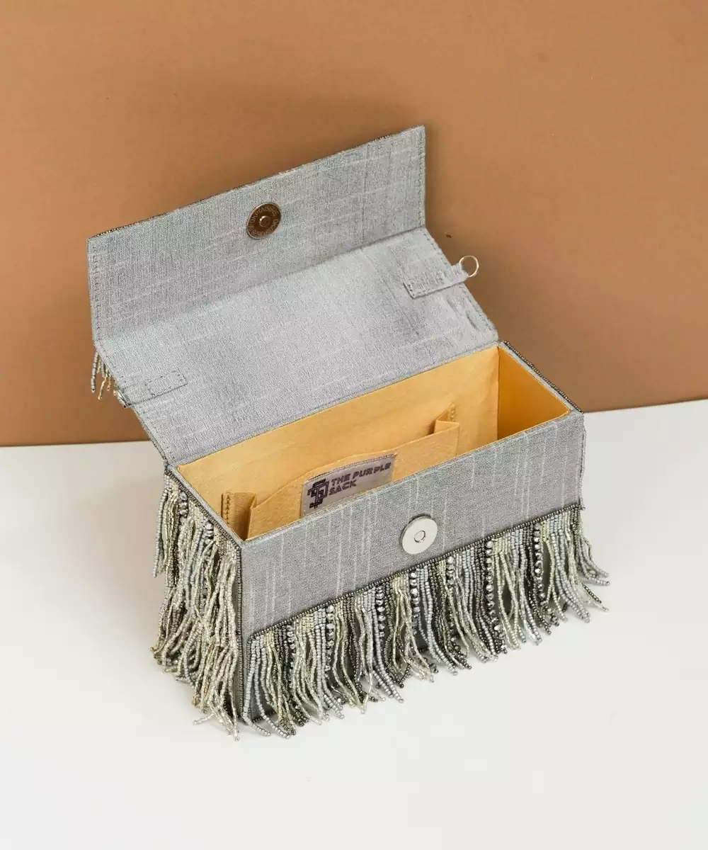 This Grey Silk Beads Embroidered Clutch Is A Sophisticated Accessory That Adds Subtle Elegance To Any Outfit. Crafted From Premium Silk, It Features Delicate Bead Embroidery That Enhances Its Charm. Compact Yet Functional, With A Secure Closure, It Is Perfect For Weddings, Parties, And Festive Occasions, Complementing Both Traditional And Contemporary Styles.