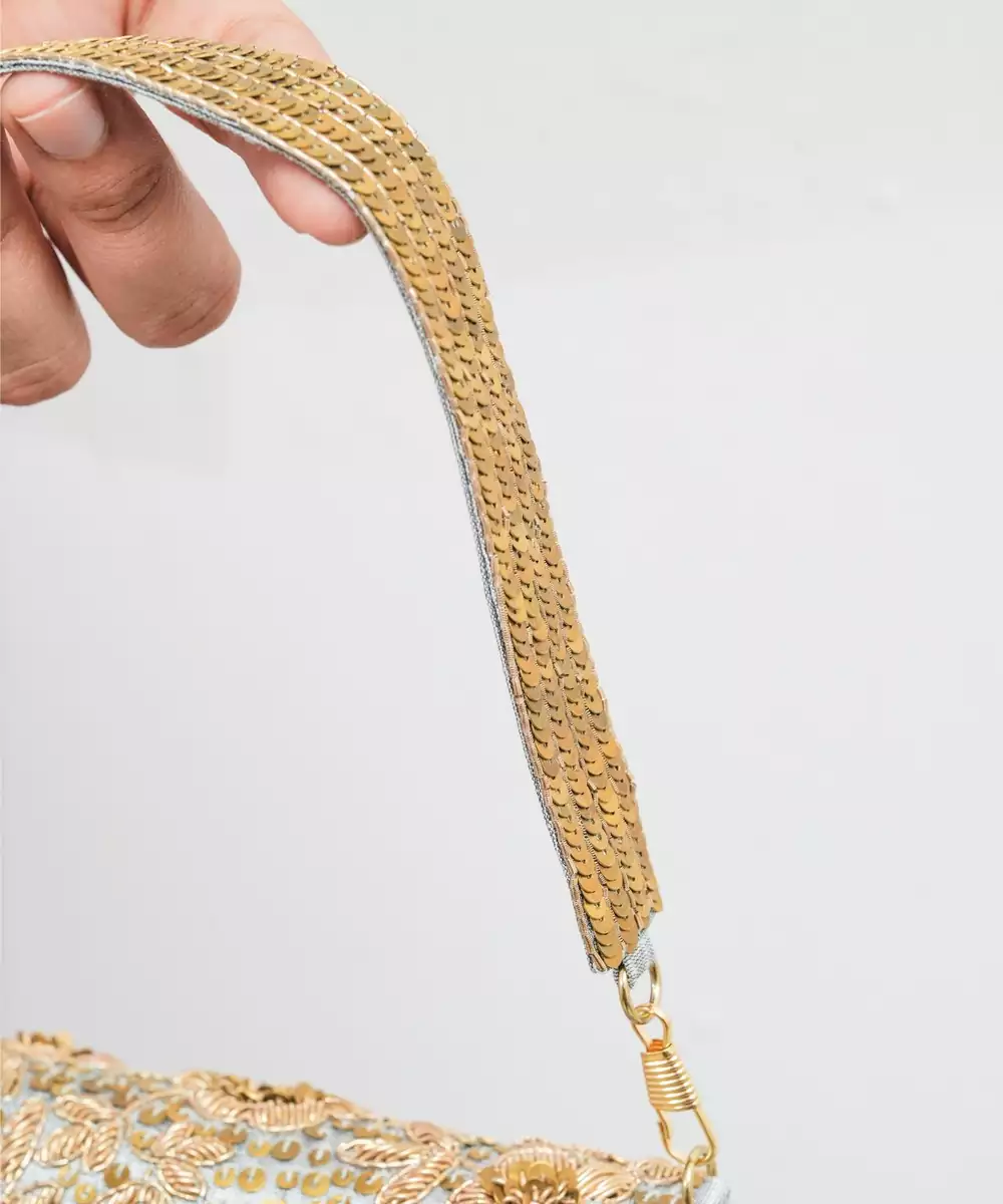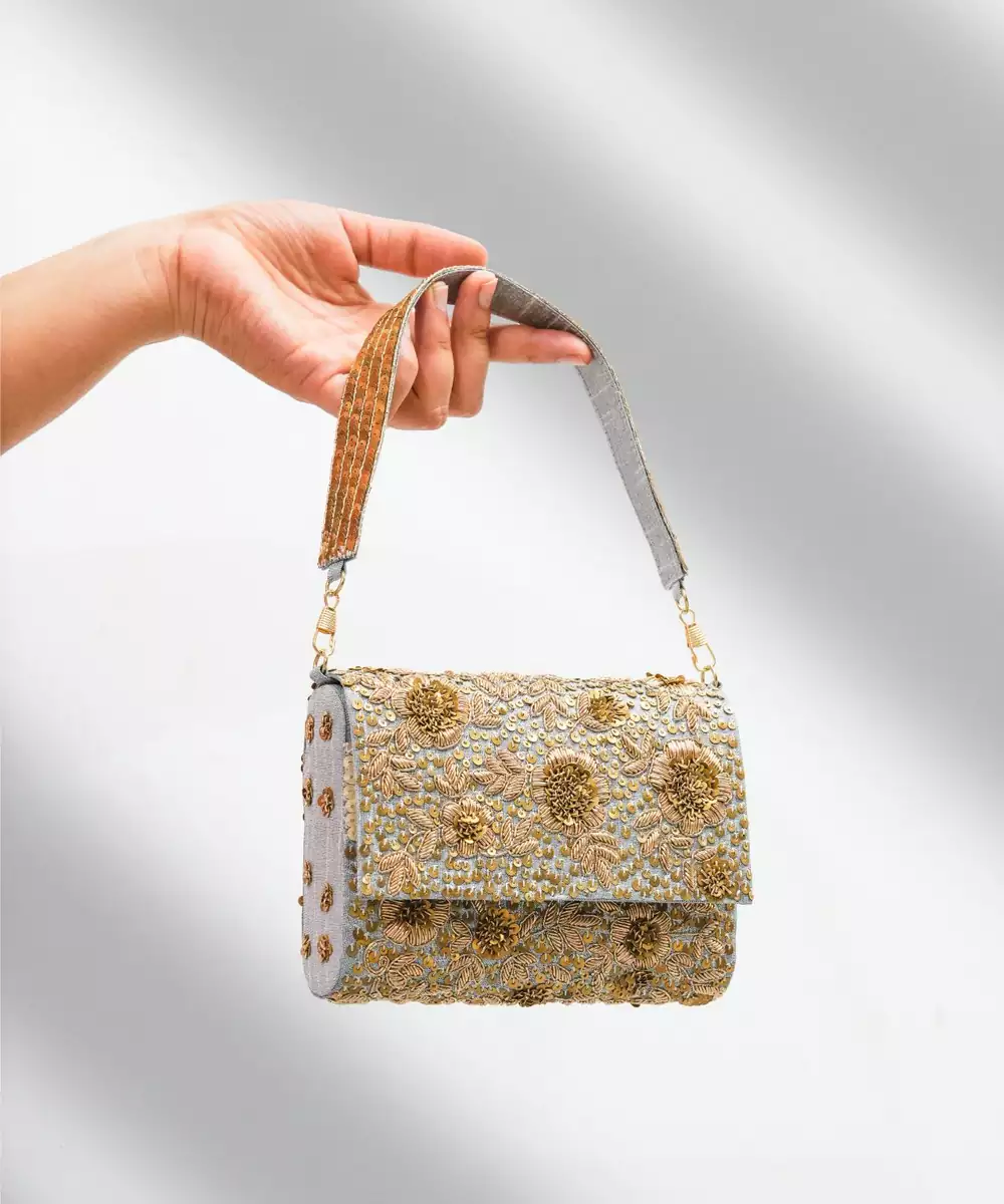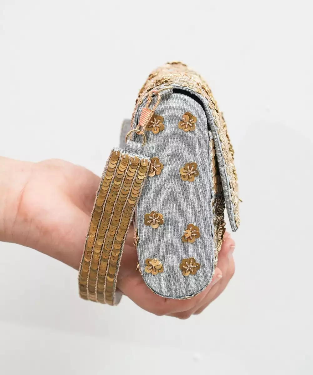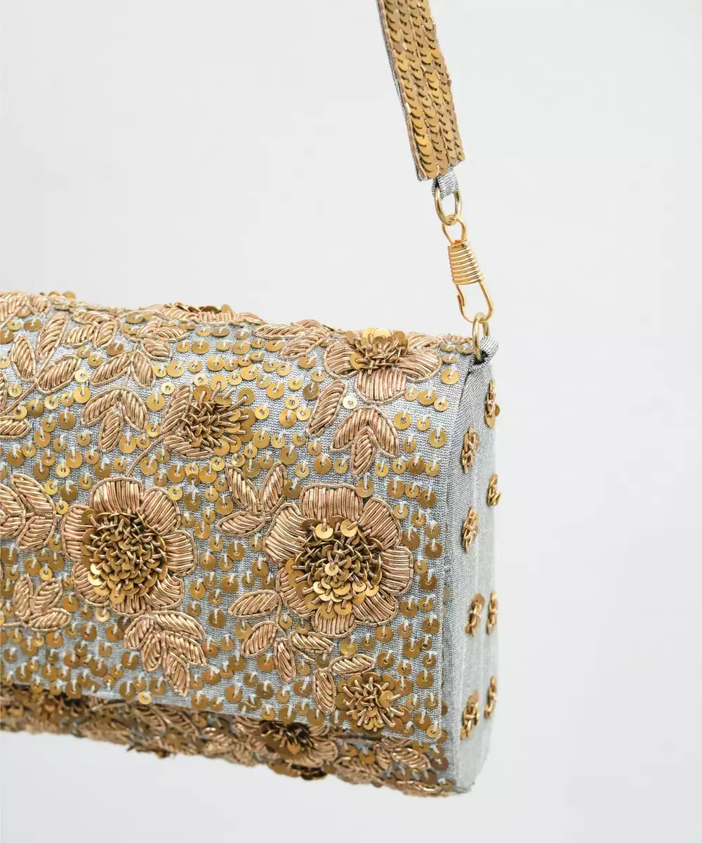 This Grey Silk Sequin Embroidered Clutch Is A Perfect Blend Of Elegance And Modern Charm. Crafted From Fine Silk, It Is Beautifully Embellished With Shimmering Sequins For A Sophisticated Sparkle. Compact Yet Spacious, It Comes With A Secure Closure, Making It An Ideal Accessory For Parties, Weddings, And Festive Celebrations.