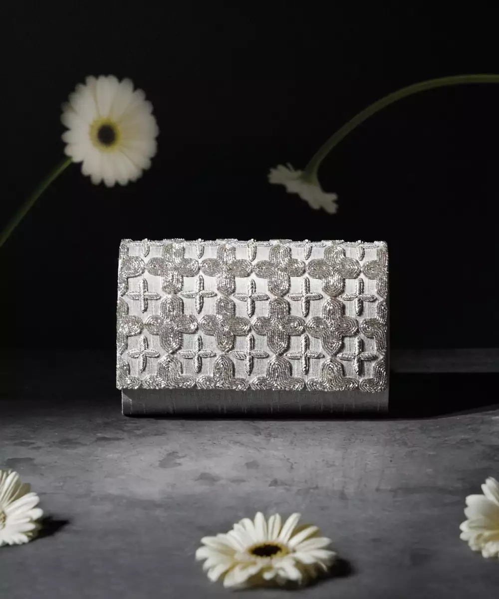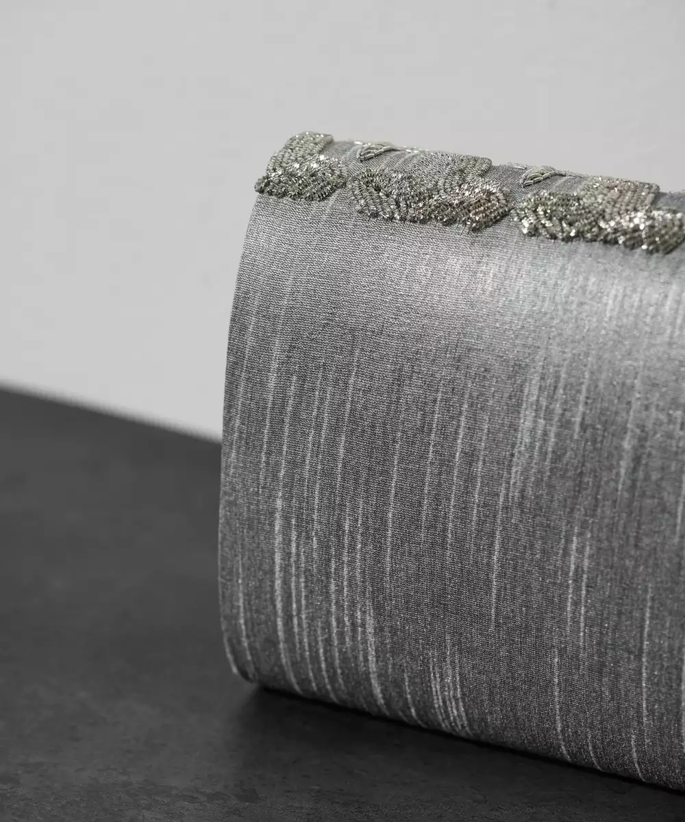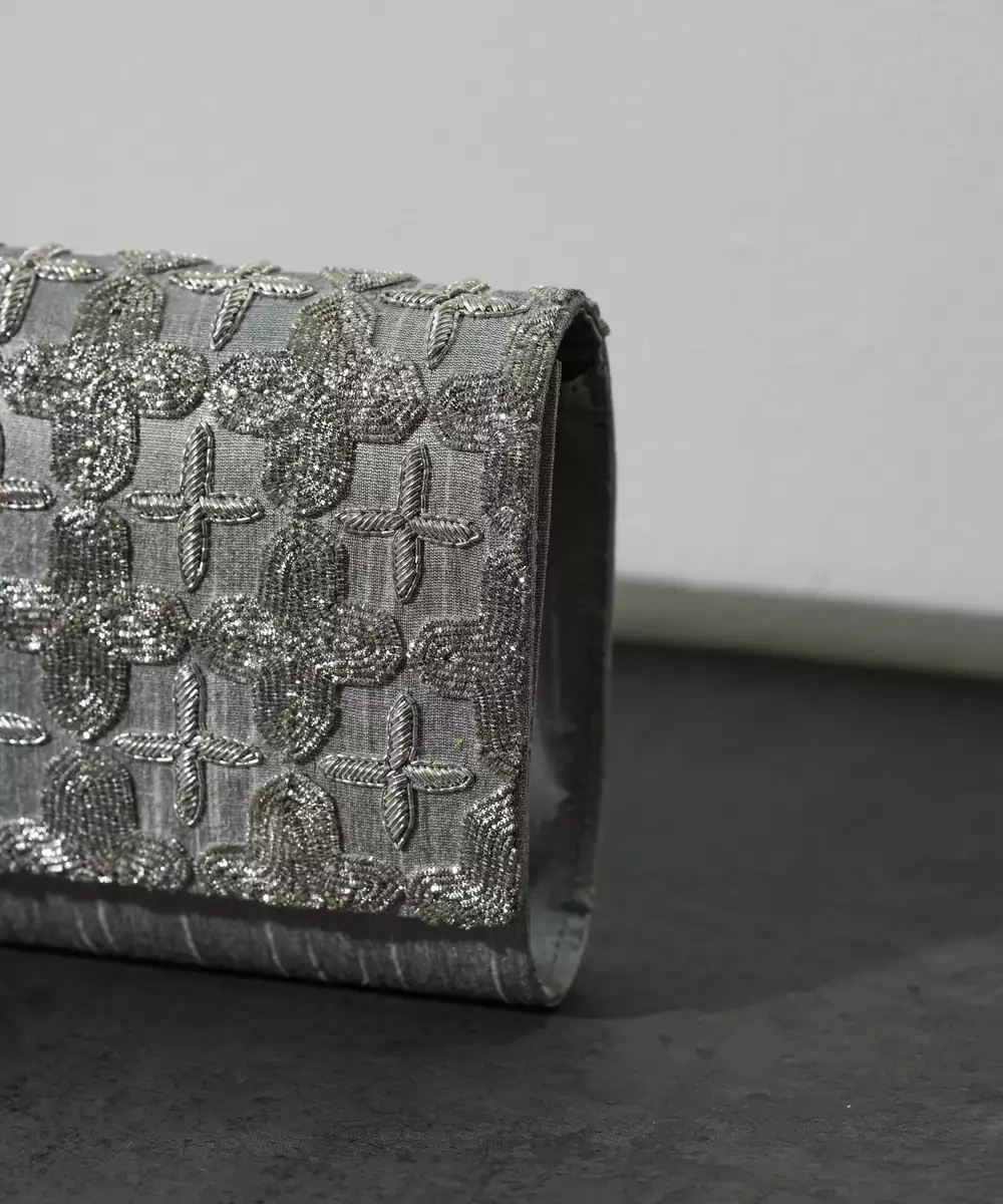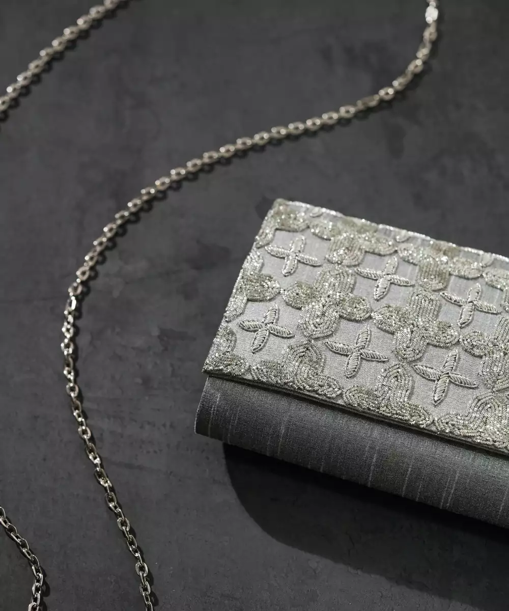 This Grey Silk Sequin Embroidered Clutch Is Designed To Add A Touch Of Glamour To Any Occasion. Made From Premium Silk, It Features Delicate Sequin Embroidery That Creates A Subtle Yet Elegant Sparkle. With Its Sleek Design And Secure Closure, It Is Perfect For Weddings, Parties, Or Evening Gatherings.