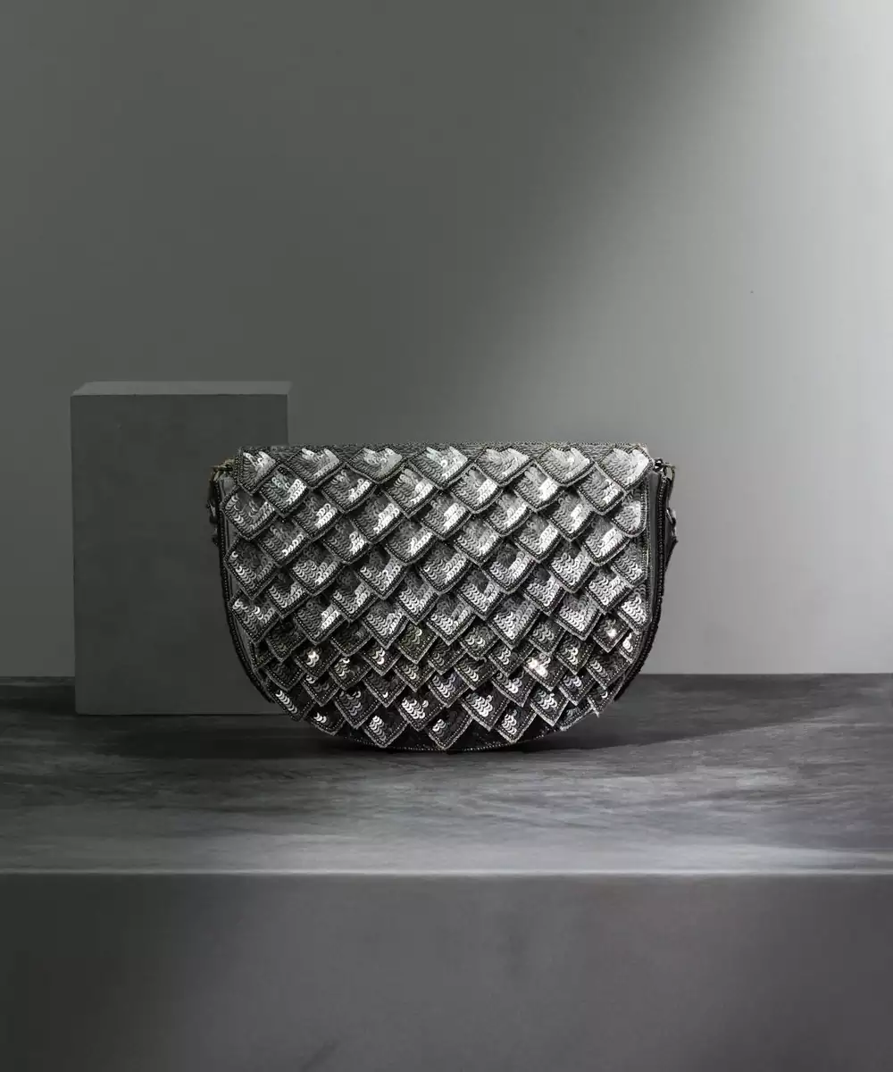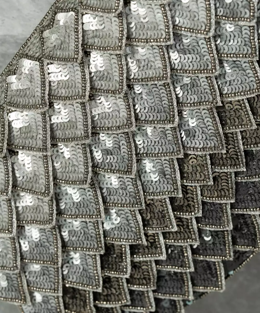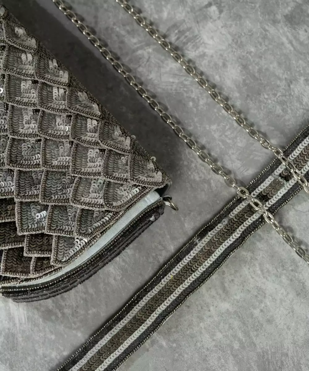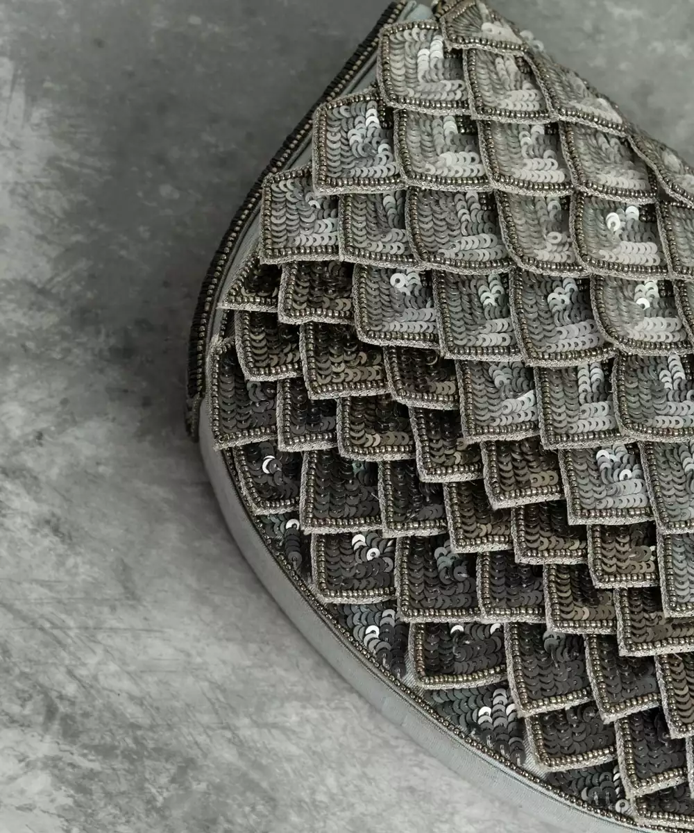 This Grey Silk Sequin Embroidered Clutch Is An Elegant Accessory That Combines Subtle Sophistication With Festive Charm. Made From Premium Silk, It Features Delicate Sequin Embroidery That Adds A Shimmering Effect. Compact Yet Functional, With A Secure Closure, It Is Perfect For Weddings, Parties, And Evening Occasions, Complementing Both Traditional And Contemporary Outfits.