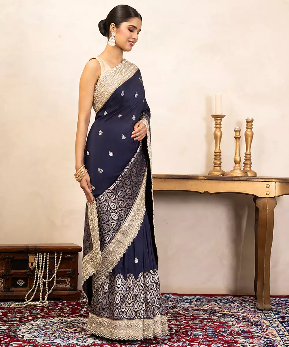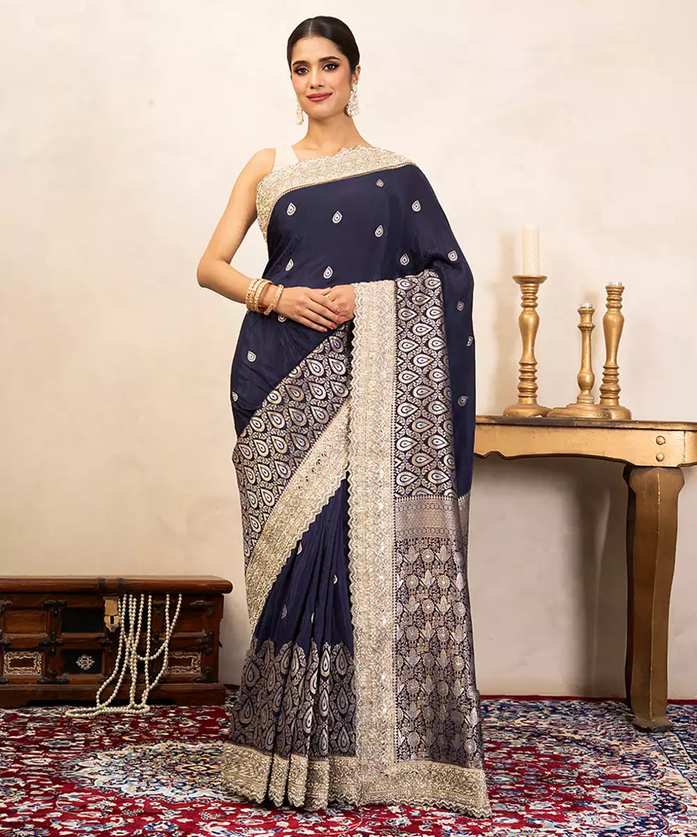 This Navy Blue Banarasi Silk Saree Highlights Exquisite Handwoven Patterns That Reflect Heritage Craftsmanship. Its Rich Texture And Graceful Drape Make It Perfect For Weddings And Celebrations. Style It With Classic Accessories To Create A Sophisticated And Timeless Ensemble Effortlessly.