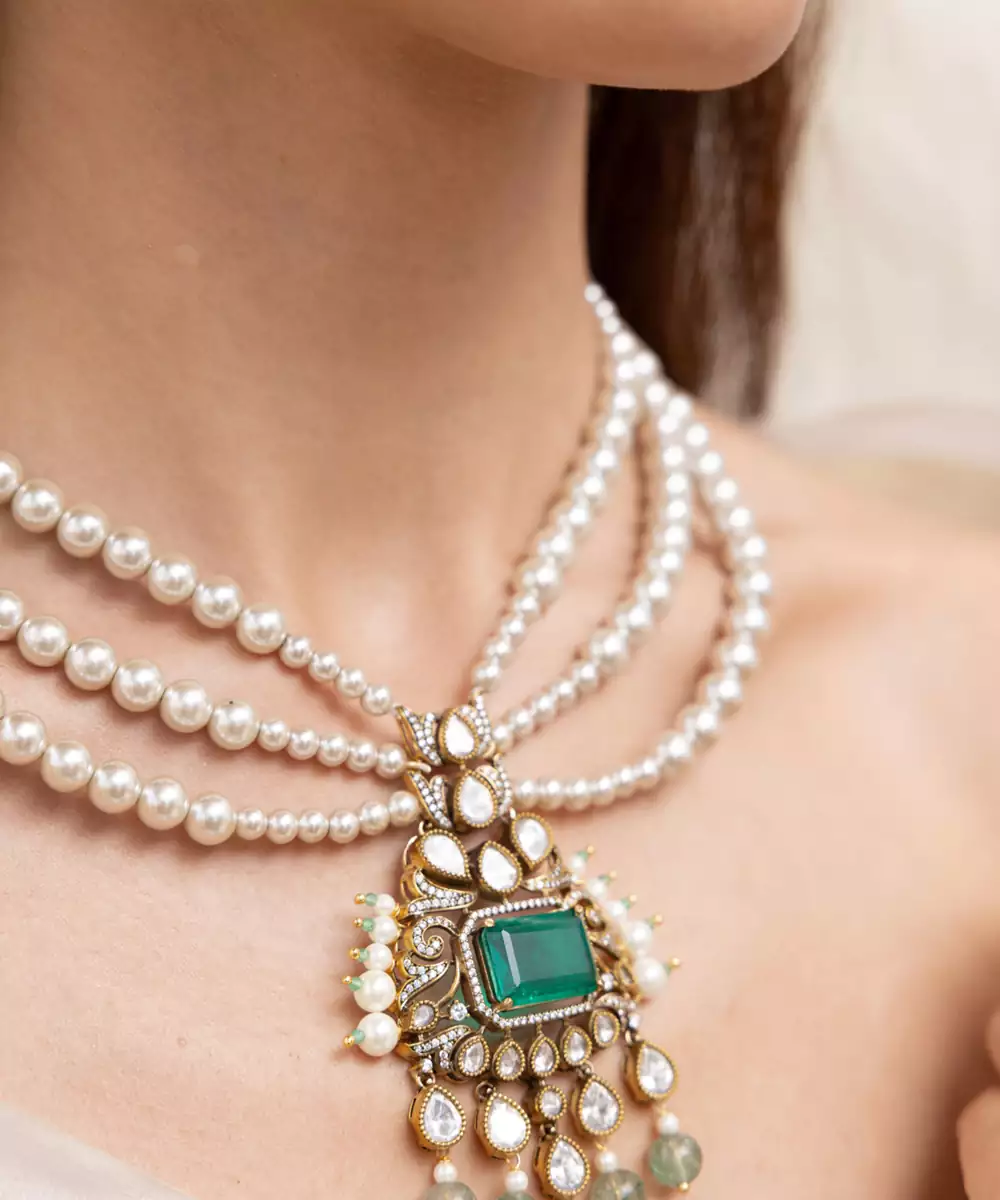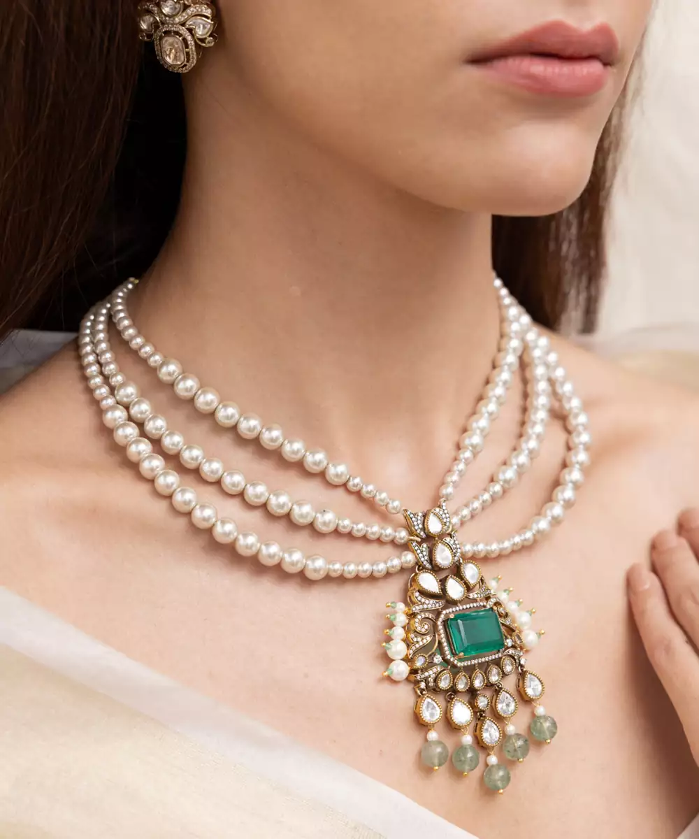 A Regal Choker With Layered Pearls And A Striking Green Gemstone Drop Pendant Framed In Kundan. Perfect For Bridal Receptions Or Royal Inspired Evening Looks.