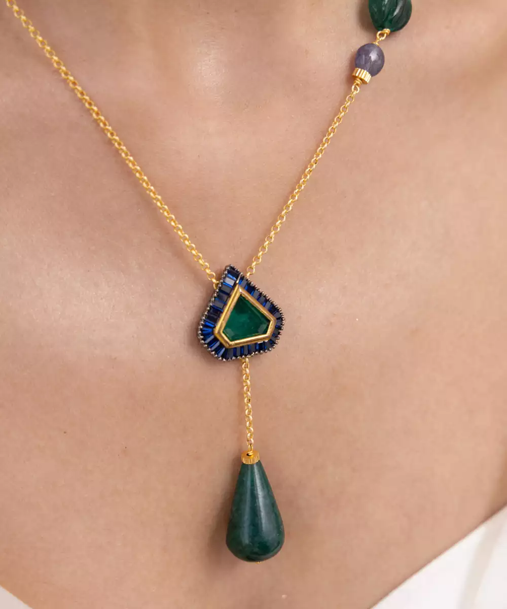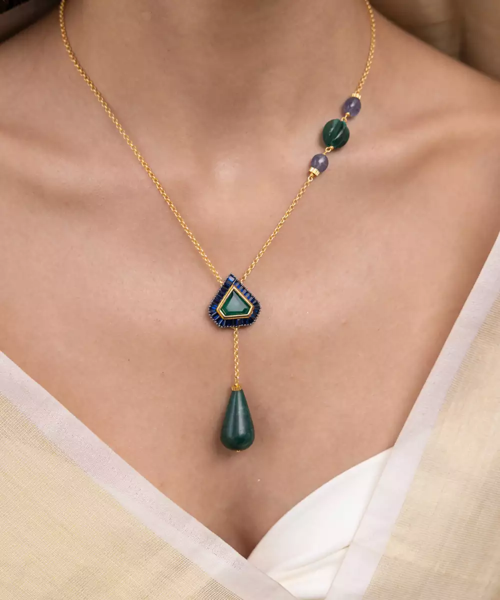A Contemporary Long Necklace Designed With Deep Blue Beads And A Triangular Pendant Accented With Tassel Detailing. With Its Minimal Yet Striking Aesthetic, It Brings Together Cultural Edge And Modern Sophistication. A Standout For Festive Luncheons Or Indo Western Events.