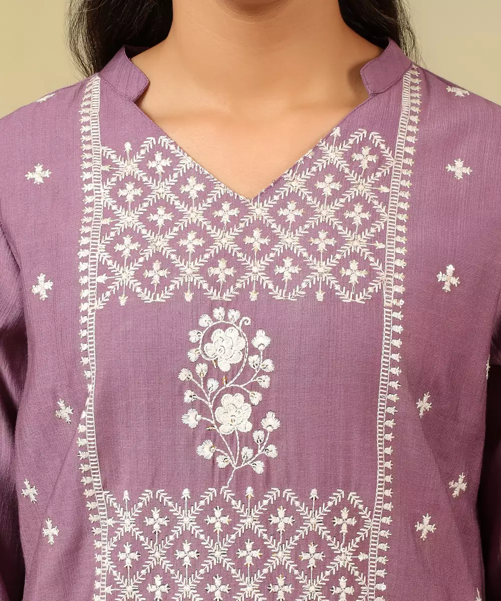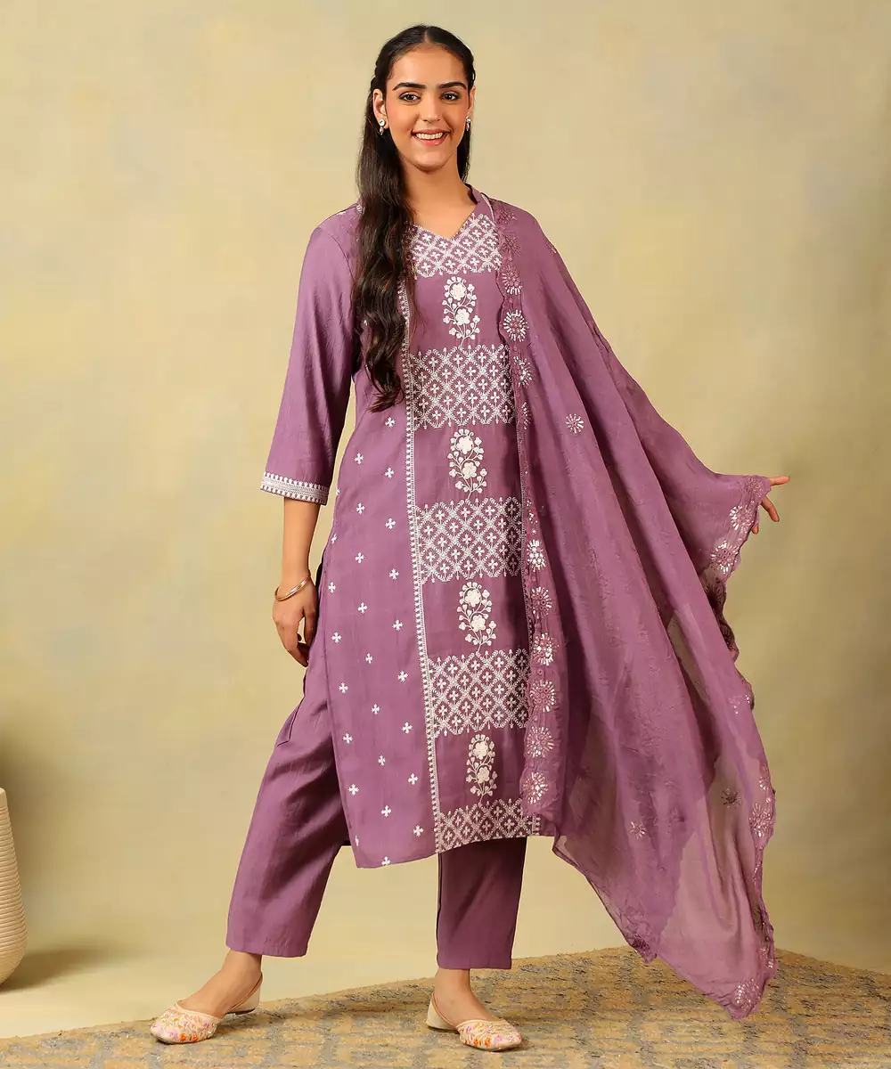 Exude Artisanal Charm With The Lavanya Set, Featuring A Sophisticated Mauve And Ivory Geometric Block Print Usp. This Elegant Suit Set Is Rendered In A Muted Mauve Lilac Hue And Is Decorated With A Detailed White Geometric Pattern And Botanical Motifs Arranged In A Sleek Vertical Panel Design. The Kurta Is Designed With A Classic Notched V Neckline And Intricate Scalloped Embroidery Along The Dupatta Border, Adding A Touch Of Traditional Sparkle To The Ensemble. Complete With Solid Mauve Trousers And A Matching Embroidered Dupatta, This Set Offers A Refined, High Impact Look For Formal Gatherings And Festivities.