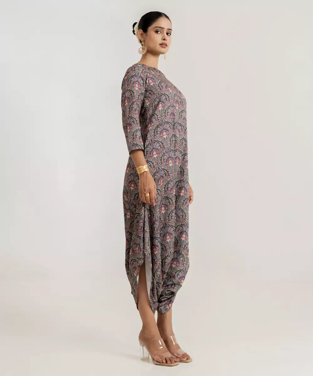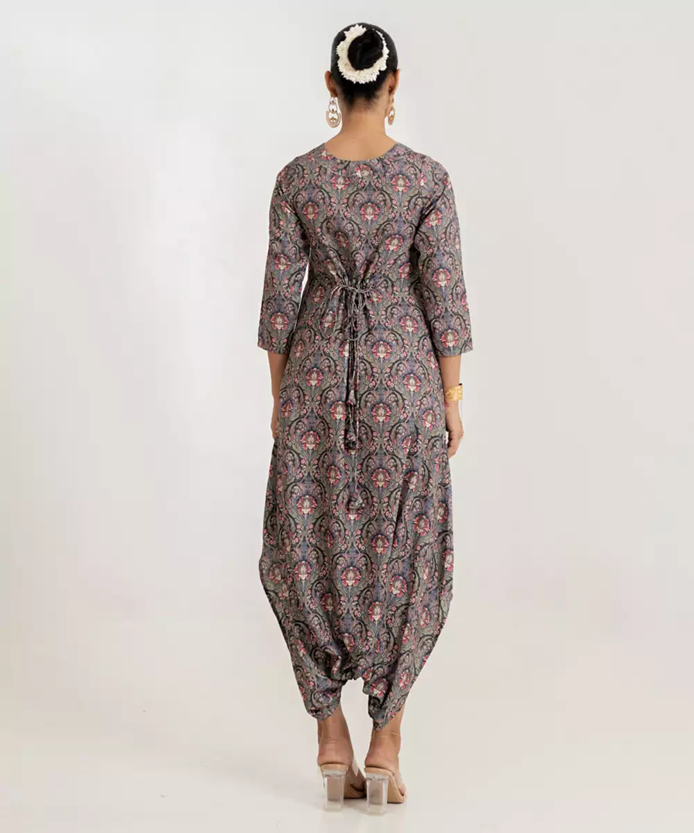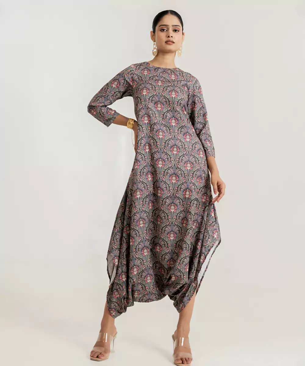 Designed For Modern Comfort, This Grey Printed Cotton Rayon Jumpsuit Features A Subtle Print On Soft Fabric. Its Relaxed Fit Ensures Ease Of Movement, Making It Ideal For Daily Wear. A Versatile Outfit That Adds A Refined Yet Casual Touch To Your Wardrobe.